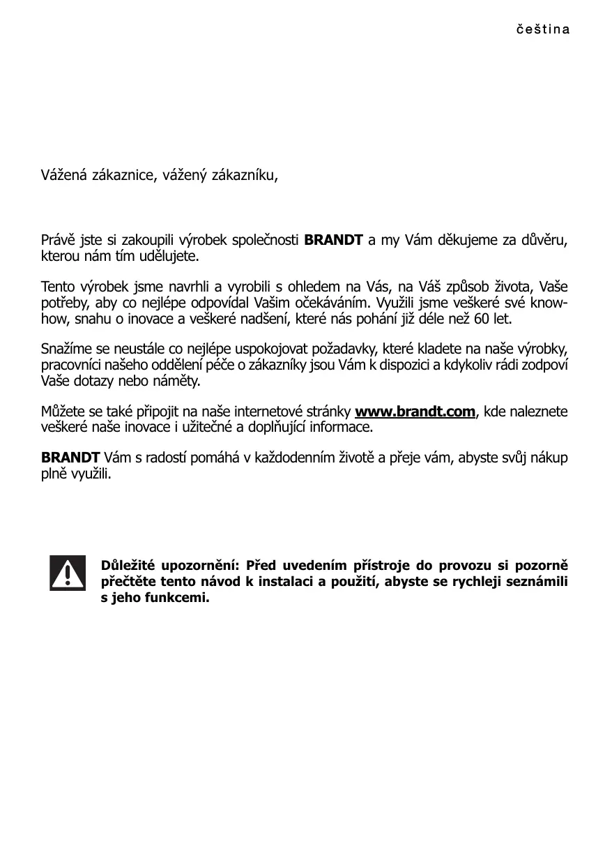Prévé jste si zakoupili vÿrobek spoleënosti BRANDT a my Väm dékujeme za düvèru, kterou nâm tim udélujete.