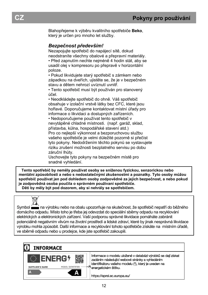 + Pokud likvidujete starÿ spotfebië s zämkem nebo zäpadkou na dverich, ujistéte se, 2e je v bezpeëném stavu a dëtem nehrozi uviznuti uvnitr. + Tento spotrebié musi bÿt pouZivän pro stanovenÿ üéel.