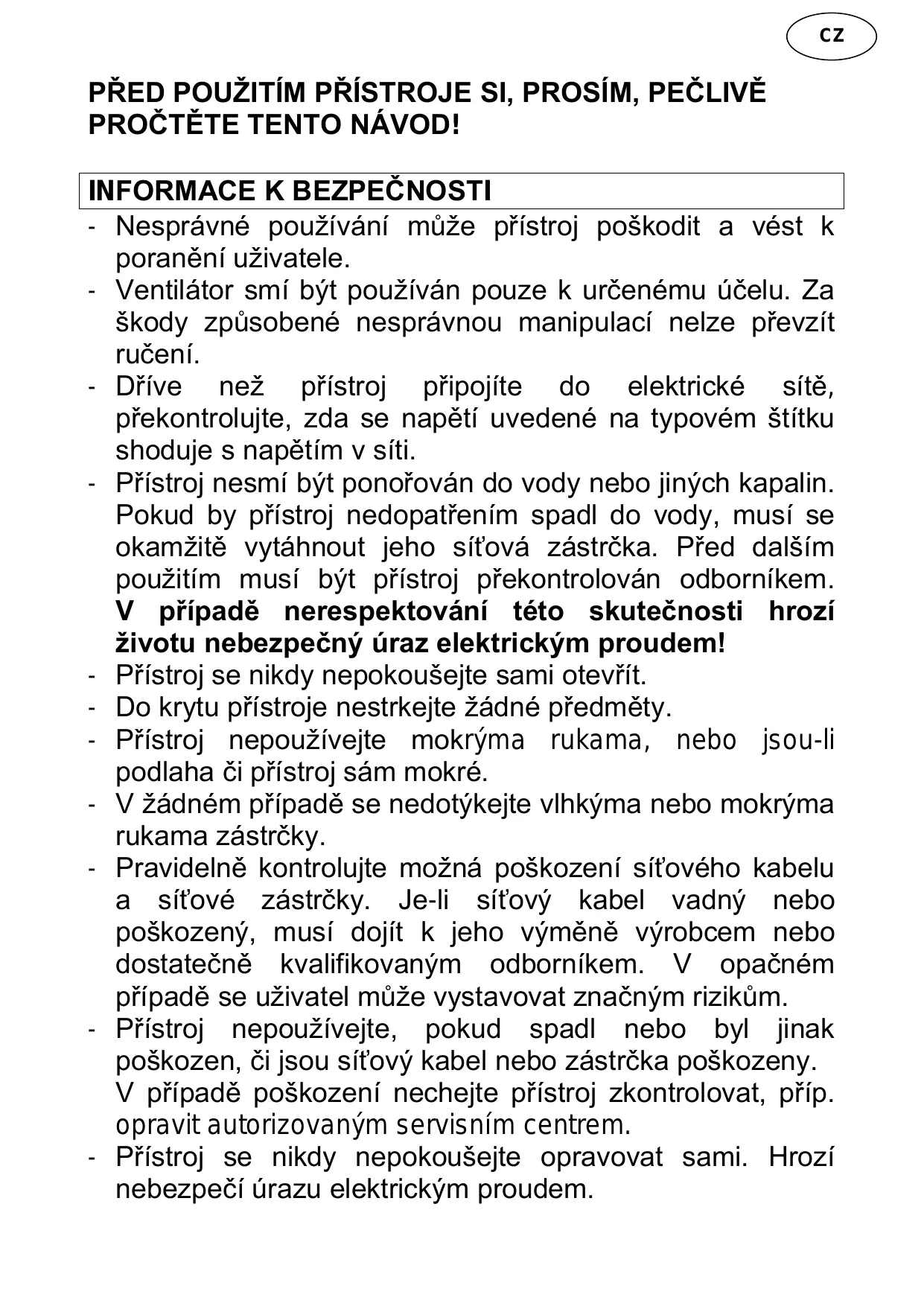 - Nesprävné pouZiväni müze pristroj poëkodit a vést k poranëni uzivatele. - Ventilâtor smi byÿt pouZivän pouze k uréenému üëelu. Za S$kody zpüsobené nesprâvnou manipulaci nelze prevzit ruceni. - Dfive neZ pristroj pripojite do elektrické sité, p'ekontrolujte, zda se napéëti uvedené na typovém ëtitku shoduje s napétim v siti. -_ Pfistroj nesmi byÿt ponoïovän do vody nebo jinÿch kapalin. Pokud by pristroj nedopatfenim spadi do vody, musi se okamzZité vytâähnout jeho sitovä zästréka. Pred dalëim pouZitim musi byÿt pristroj p'ekontrolovän odbornikem. V pripadëé nerespektoväni této skuteënosti hrozi Zivotu nebezpeënyÿ üraz elektrickÿm proudem! -_ Pfistroj se nikdy nepokouÿejte sami otevrit. -_ Do krytu pristroje nestrkejte Zädné p'edméty. - Pfistroj nepouzivejte mokrÿma rukama, nebo jsou-li podlaha ëi pristroj sâm mokré. - V Zädném pripadé se nedotykejte vihkÿma nebo mokrÿma rukama zästrüky. - Pravidelné kontrolujte moZné poëkozeni sitového kabelu a sitové zästréky. Je-li sitovÿy kabel vadnÿ nebo poëkozeny, musi dojit k jeho vÿmënëé vÿrobcem nebo dostateëné kvalifikovanÿm odbornikem. V opaëném p'ipadé se uZivatel müZe vystavovat znaënyÿm riziküm. - Pistroj nepouzivejte, pokud spadl nebo byl jinak poëkozen, ëi jsou sitovy kabel nebo zästrëka poëkozeny. V pripadë poëkozeni necheijte pristroj zkontrolovat, prip. opravit autorizovanÿm servisnim centrem. - Pistroj se nikdy nepokouëejte opravovat sami. Hrozi nebezpeëi ürazu elektrickÿm proudem.