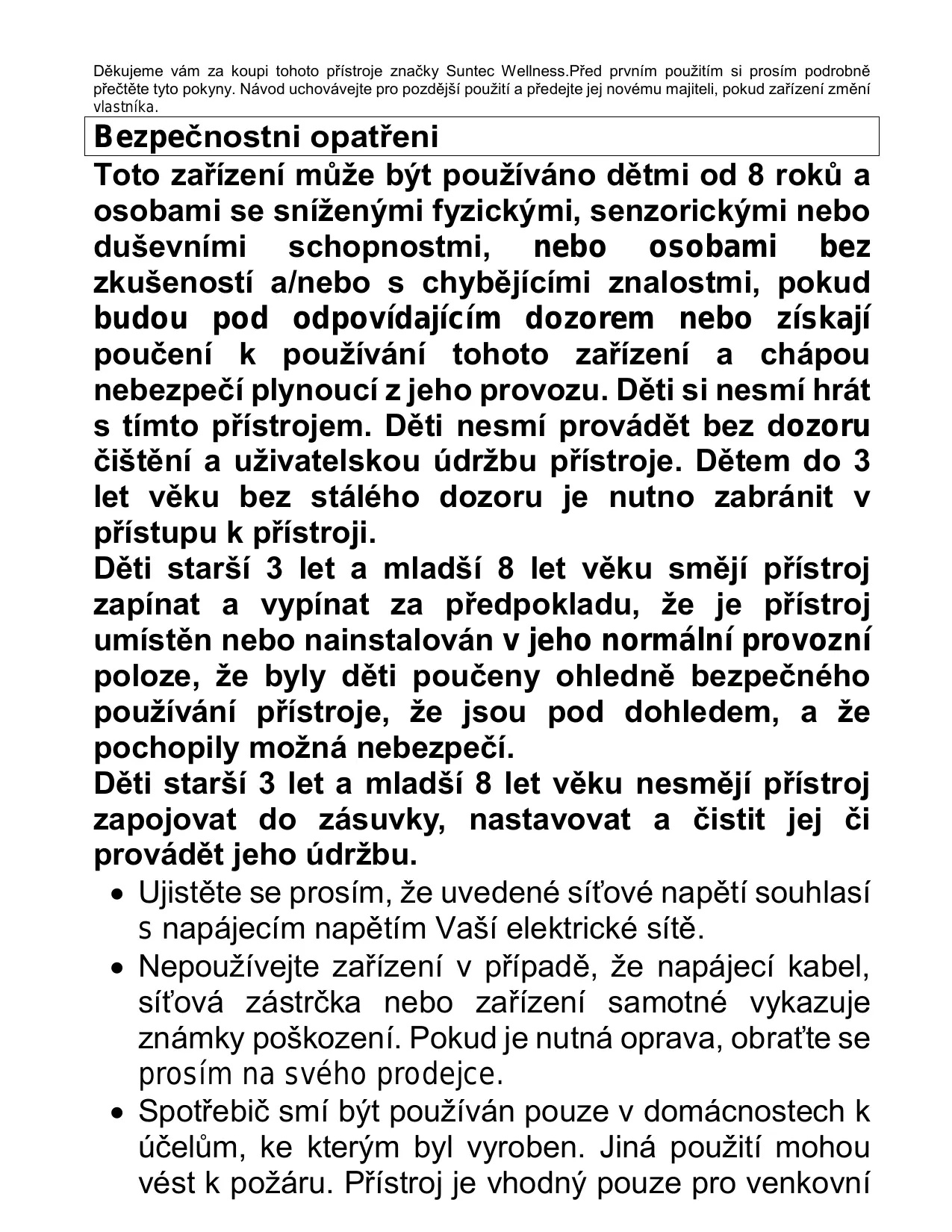 Zäruëni listina Za tento pristroj neseme zäruku po dobu 24 mésicül! Zavazujeme se k tomu, Ze béhem 24mësiëni zäruëni doby bude Väë pristroj zdarma opraven, pripadnë poskytneme Va$emu prodejci zdarma nâhradni dily, a to pokud doëlo k selhäni v dûsledku chyb ve vyrobë nebo materiälovÿch vad. Dal$i nâroky vüëi n4m jsou vylouéeny. Neneseme odpovédnost za #kody zpüsobené vyë$i moci, nesprävnÿm pouzitim, nedodrzenim pokynü, opotrebenim v düsledku ëastého pouzZiväni nebo pri prepravë. Tato zäruëni listina je platnä pouze spolu s platnou üëtenkou. V pripadé potreby üdrZby prineste prosim zakoupenÿ vÿrobek Va$emu prodejci. Näzev vÿrobku: Sériové éëislo: Jméno kupujiciho: Datum näkupu: Razitko a podpis prodejce: Vÿrobce: Suntec Wellness GmbH HolzstraRe 2