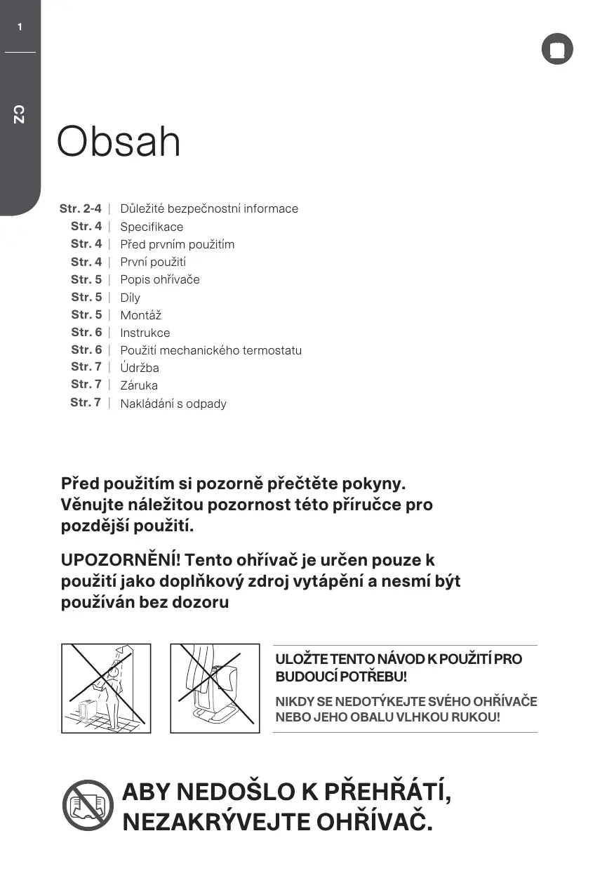 - Le chauffage devient chaud quand il est allumé. Par conséquent, faîtes attention à éviter les brûlures sur votre peau.