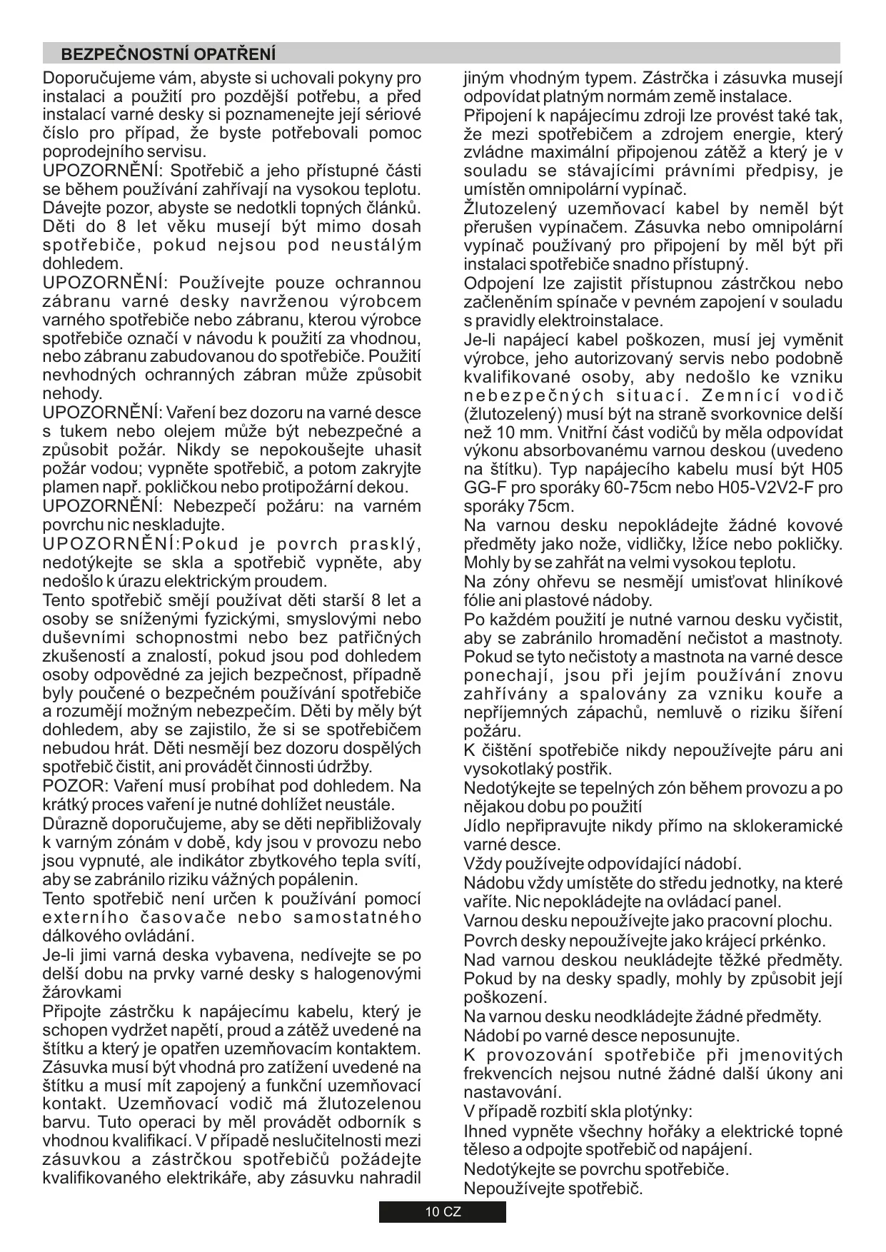 AVERTISSEMENT : l'appareil et ses parties accessibles chauffent pendant l'utilisation. Evitez de toucher les éléments chauffants. Les enfants de moins de 8 ans doivent être tenus hors de portée de l'appareil, sauf s'ils sont surveillés en permanence. AVERTISSEMENT : n'utilisez qu'un dispositif de rotection de votre table de cuisson conçu par le abricant de votre appareil ou indiqué, dans le manuel d'utilisation, comme étant compatible, ou bien le dispositif de protection fourni avec l'appareil. L'utilisation d'un dispositif de protection non approprié peut causer des accidents. AVERTISSEMENT : l'utilisation de la table de cuisson sans surveillance avec manipulation de graisse ou d'huile peut être dangereux et provoquer un incendie. N'essayez JAMAÏS d'éteindre un feu avec de l'eau, mais éteignez l'appareil, puis couvrez la flamme avec un couvercle où une couverture anti-feu, par exemple. AVERTISSEMENT, risque d'incendie : ne stockez pas d'éléments sur les surfaces de cuisson. AVERTISSEMENT : si la surface est fissurée, ne touchez pas le verre de la table et éteignez l'appareil pour éviter tout risque d'électrocution. Cet appareil peut être utilisé par des enfants âgés de 8 ans et plus, par des personnes dont les capacités physiques, sensorielles ou mentales sont réduites où par des personnes dénuées d'expérience et de connaissances, mais qui ont été informées sur la manière d'utiliser l'appareil en toute sécurité, si elles comprennent les risques impliqués. Surveillez les enfants afin qu'ils ne jouent pas avec l'appareil. L'entretien et le nettoyage ne doivent pas être effectués par des enfants Sans surveillance. ATTENTION : la cuisson demande d'être surveillée. Les cuissons de courte durée doivent être surveillées en permanence. Il est chaudement recommandé d'éloigner les enfants de la zone de cuisson lorsqu'elle fonctionne ou même quand elle est éteinte, mais que l'indicateur de chaleur résiduelle est encore visible, afin d'éviter tout risque de brûlures graves. Cet appareil n'est pas conçu pour être actionné par un temporisateur externe ou un système séparé de commande à distance. Si votre table de cuisson est dotée d'éléments halogènes, n'en fixez pas la lumière. Brancher le câble d'alimentation sur une prise de courant qui supporte le voltage (le courant et la charge sont indiqués sur l'étiquette) et vérifier la présence d'une mise à la terre. La prise d'alimentation doit supporter la charge indiquée sur l'étiquette et être dotée d'une mise à la terre en état de fonctionnement. Le câble conducteur de mise à la terre est jaune et vert. Cette opération doit être exécutée par du personnel qualifié. En cas d'incompatibilité entre la prise d'alimentation et la fiche du câble de l'appareil. demander à un électricien professionnel de remplacer la prise d'alimentation par un dispositif compatible. La fiche du câble d'alimentation et la prise d'alimentation doivent être conformes aux normes en vigueur dans le pays d'installation. Il est possible de brancher l'appareil à la prise