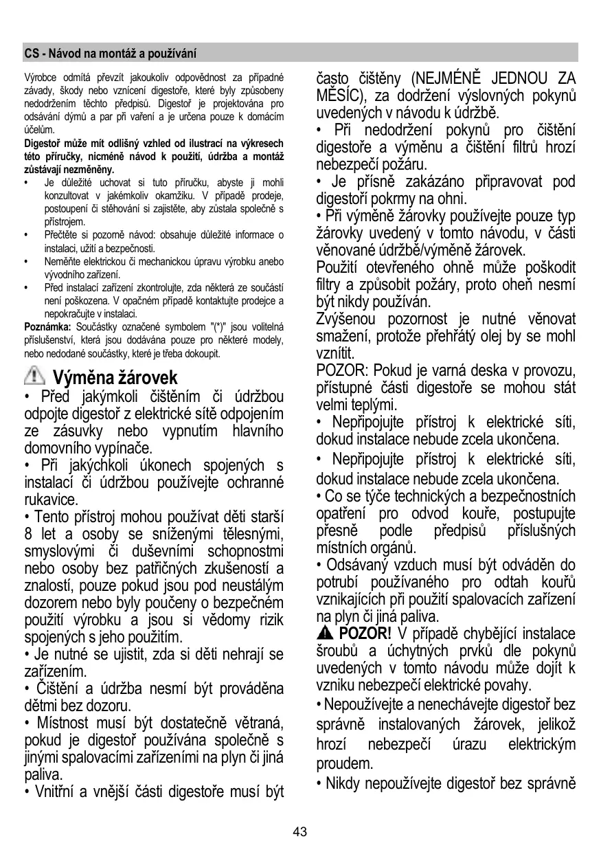 POZOR: Pokud je varnä deska v provozu, pristupné Gâsti digestoïe se mohou stât velmi teplÿmi.