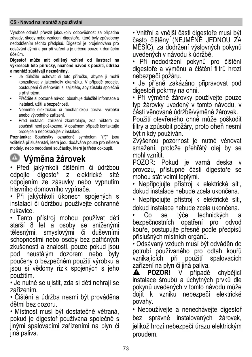 + La hotte ne doit JAMAIS être utilisée comme une surface d'appui, sauf indication expresse.