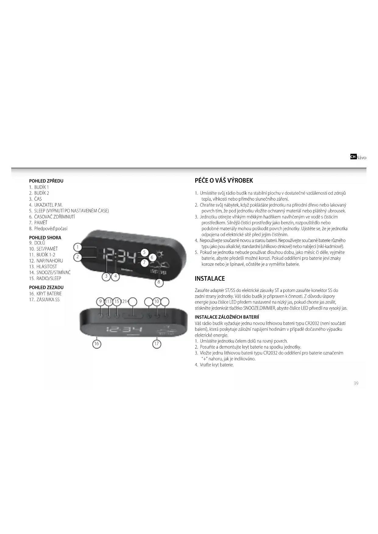 baterie, abyste předešli možné korozi. Pokud oddělení pro baterie jeví znaky koroze nebo je špinavé, očistěte je a vyměňte baterie. INSTALACE Zasuňte adaptér ST/SS do elektrické zásuvky ST a potom zasuňte konektor SS do zadní strany jednotky. Váš rádio budík je připraven k činnosti. Z důvodu úspory energie jsou číslice LED předem nastavené na nízký jas, pokud chcete jas zesílit, stiskněte jedenkrát tlačítko SNOOZE.DIMMER, abyste číslice LED přivedli na vysoký jas.