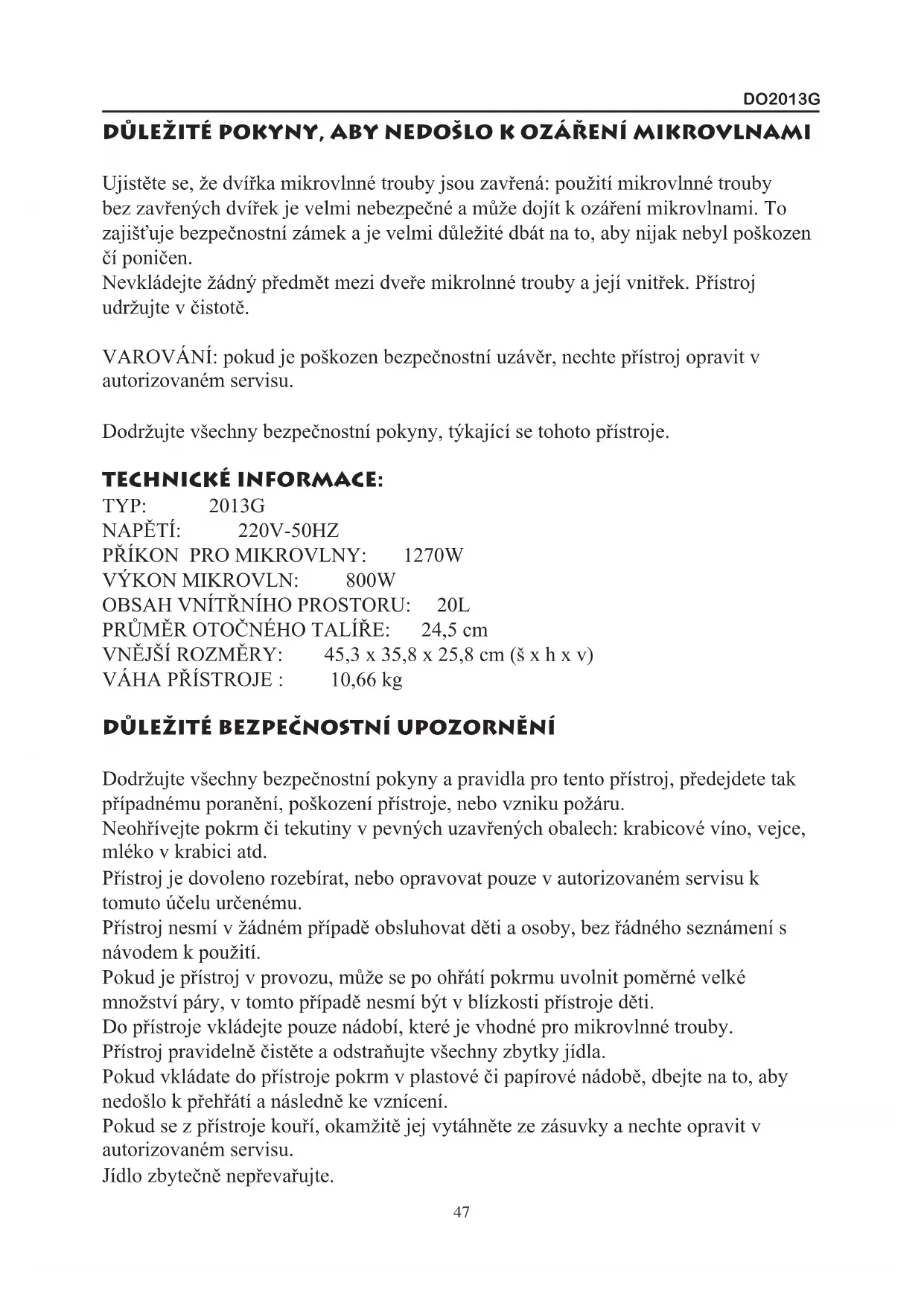 46DO2013G DŮLEŽITÉ POKYNY, ABY NEDOŠLO K OZÁŘENÍ MIKROVLNAMI Ujistěte se, že dvířka mikrovlnné trouby jsou zavřená: použití mikrovlnné trouby