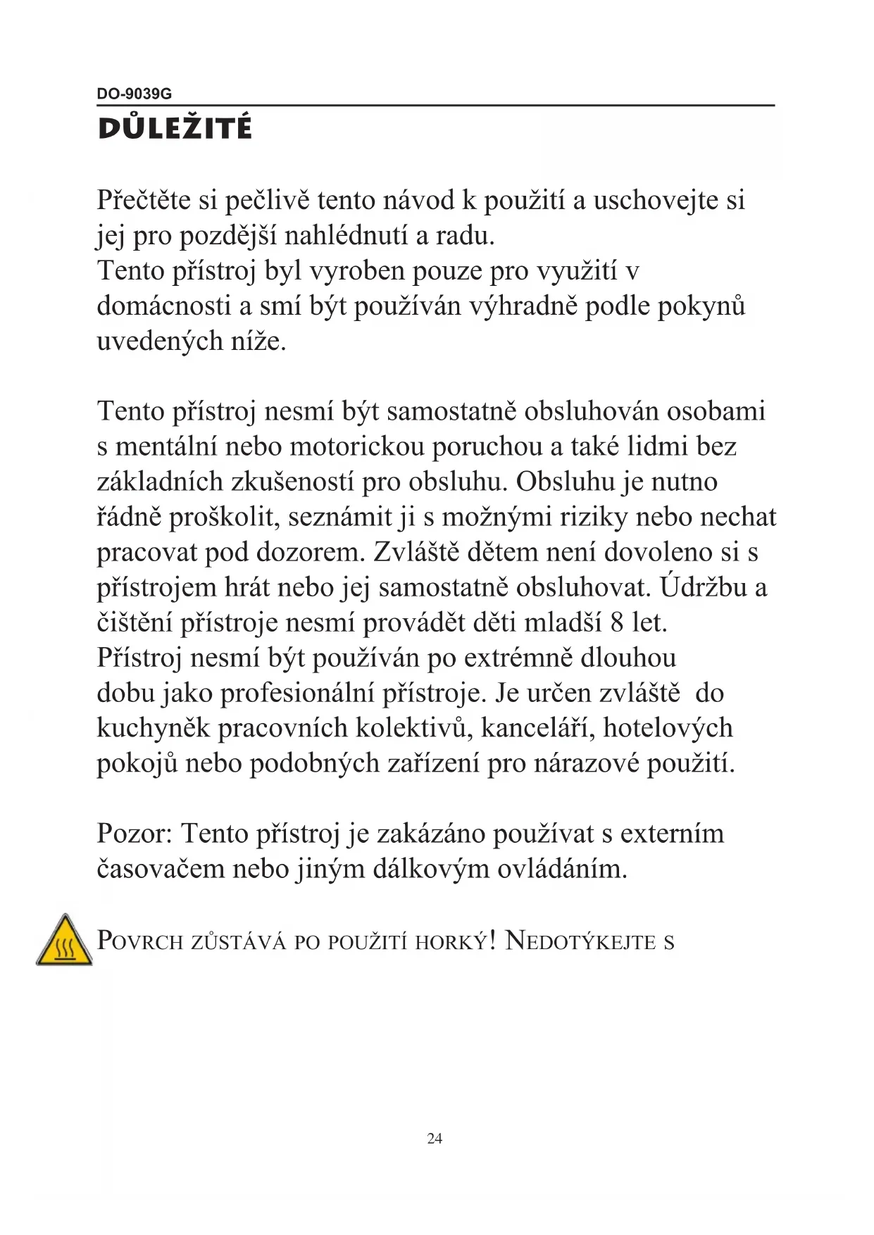 Povrch zůstává po použití horký! Nedotýkejte sD0-9039G