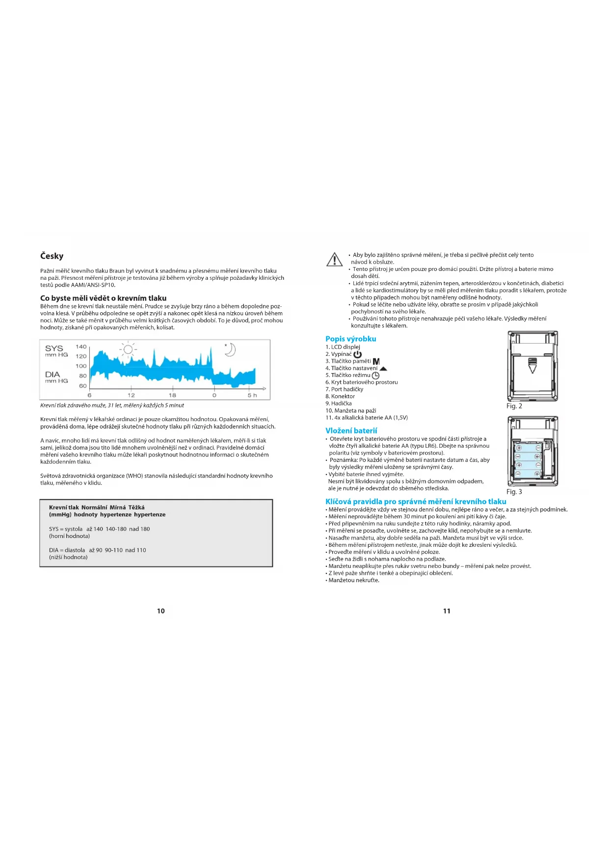 Česky Pažní měřič krevního tlaku Braun byl vyvinut k snadnému a přesnému měření krevního tlaku na paži. Přesnost měření přístroje je testována již během výroby a splňuje požadavky klinických testů podle AAMI/ANSI-SP10. Co byste měli vědět o krevním tlaku Během dne se krevní tlak neustále mění. Prudce se zvyšuje brzy ráno a během dopoledne poz- volna klesá. V průběhu odpoledne se opět zvýší a nakonec opět klesá na nízkou úroveň během noci. Může se také měnit v průběhu velmi krátkých časových období. To je důvod, proč mohou hodnoty, získané při opakovaných měřeních, kolísat. Krevní tlak zdravého muže, 31 let, měřený každých 5 minut Krevní tlak měřený v lékařské ordinaci je pouze okamžitou hodnotou. Opakovaná měření, prováděná doma, lépe odrážejí skutečné hodnoty tlaku při různých každodenních situacích. A navíc, mnoho lidí má krevní tlak odlišný od hodnot naměřených lékařem, měří-li si tlak sami, jelikož doma jsou tito lidé mnohem uvolněnější než v ordinaci. Pravidelné domácí měření vašeho krevního tlaku může lékaři poskytnout hodnotnou informaci o skutečném každodenním tlaku. Světová zdravotnická organizace (WHO) stanovila následující standardní hodnoty krevního tlaku, měřeného v klidu. Popis výrobku