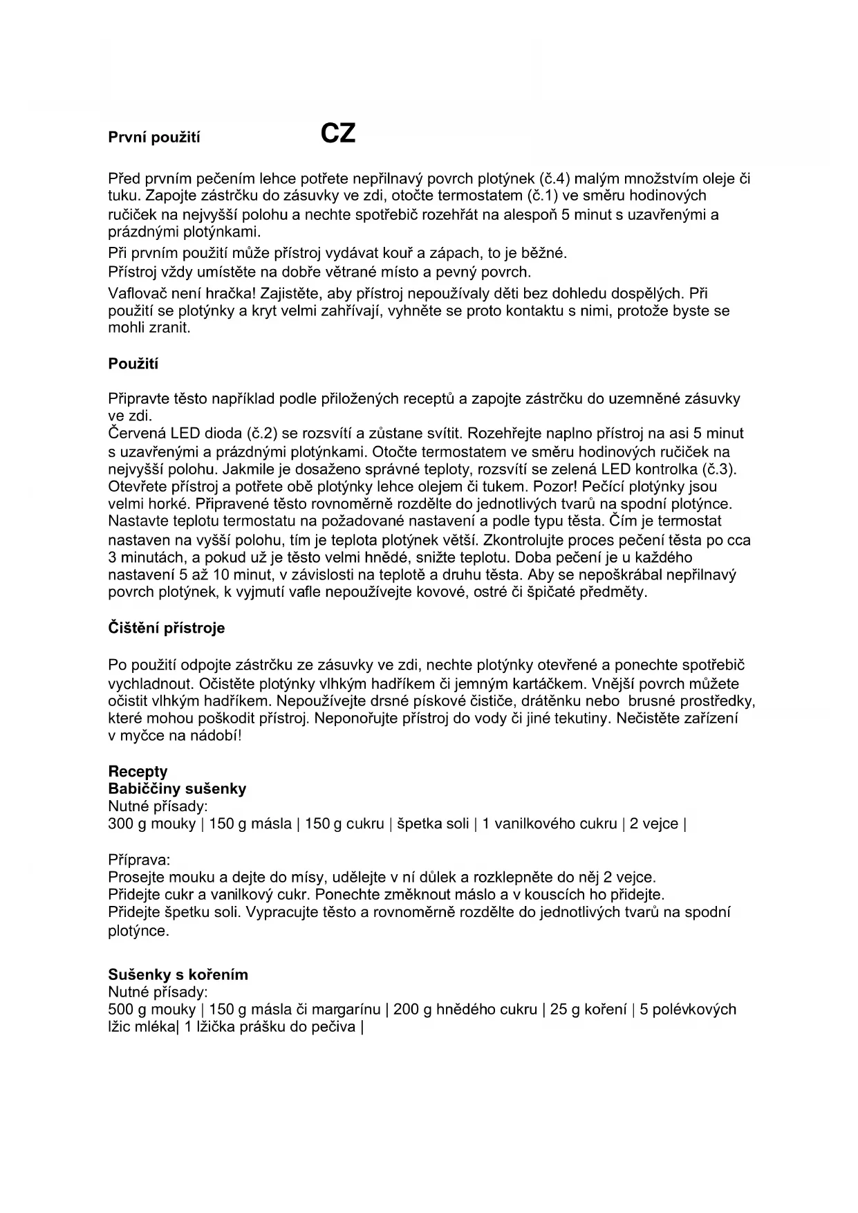93/68/EEC sz. irányelv biztonsági előírásait.První použití CZ Před prvním pečením lehce potřete nepřilnavý povrch plotýnek (č.4) malým množstvím oleje či