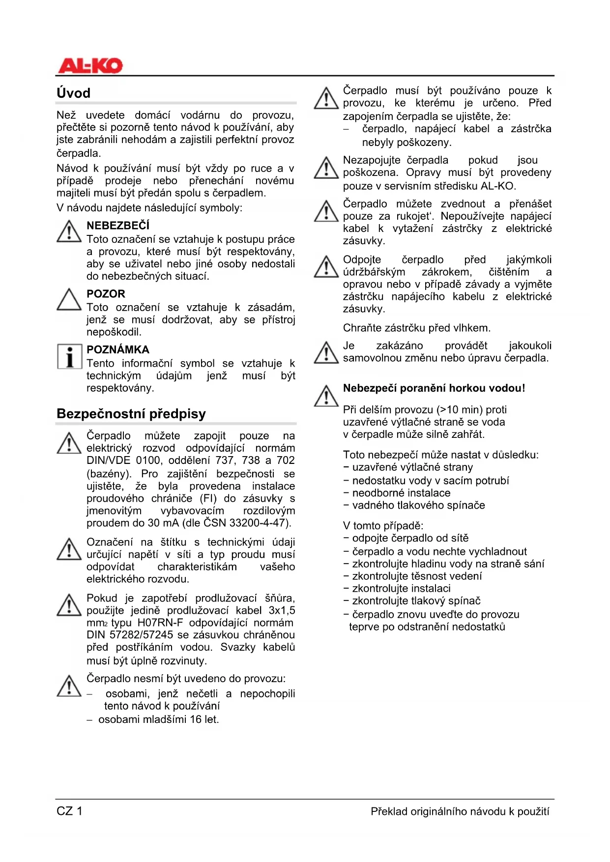 CZ 1 Překlad originálního návodu k použitíPoužívání Překlad originálního návodu k použití CZ 2 Předpokládané používání Čerpadlo je určeno k domácímu používání v domě a na zahradě. Musí být používáno pouze k účelům odpovídajícím jeho technickým vlastnostem. Čerpadlo je vhodné k následujícím účelům: − zavlažování zahrad a polí − zásobování vody v domácnosti − zvýšení tlaku při zásobování vody v domácnosti. Dejte pozor na místní normy stanovené pro zásobování. Pora'te se s instalatérem. Čerpadlo je vhodné pouze k pumpování těchto kapalin: − čistá voda − dešt‘ová voda Zakázané používání Čerpadlo nesmí být používáno na nepřetržitý provoz. Čerpadlo není vhodné na pumpování: − slané vody; − tekutých potravin; − kal obsahující textilní nebo papírový zbytkový materiál; − korozivních a chemických látek; − kyselých, vznětlivých, výbušných nebo těkavých kapalin; − kapalin teplejších než 35˚ C; − vody s pískem nebo brusných kapalin. Popis čerpadla Domácí vodárna/příslušenství (obrázky A a B) 1 Tělo čerpadla 2 Plnící zátka 3 Výstupní otvor/napojení na výtlačné potrubí 4 Motorová část 5 Ventil 6 Nádrž 7 Tlakoměr 8 Napájecí kabel 9 Vypouštěcí zátka (prostor čerpadla) 10 Snímač tlaku 11 Ohebná trubice 12 Vypouštěcí zátka (prostor filtru) 13 Sací otvor/napojení na sácí potrubí 14 Kryt filtru s průhledem 15 Kolenová spojka 16 Ploché těsnění 17 Spojovací vsuvka 18 Kruhové těsnění 19 Výtlačné potrubí (příslušenství) 20 Sací soubor AL-KO (příslušenství) 21 Těsnění filtru 22 Filtr 23 Zpětný ventil 24 Těsnění 25 Kruhové těsnění (krytu s průhledem prostoru filtru) 26 Ploché těsnění Základní vybavení Domácí vodána zahrnuje snímač tlaku, tlakoměr, nápájecí kabel se zásuvkou Schuko. Součástí dodávky je rovněž klíč na filtr (viz obr. C).