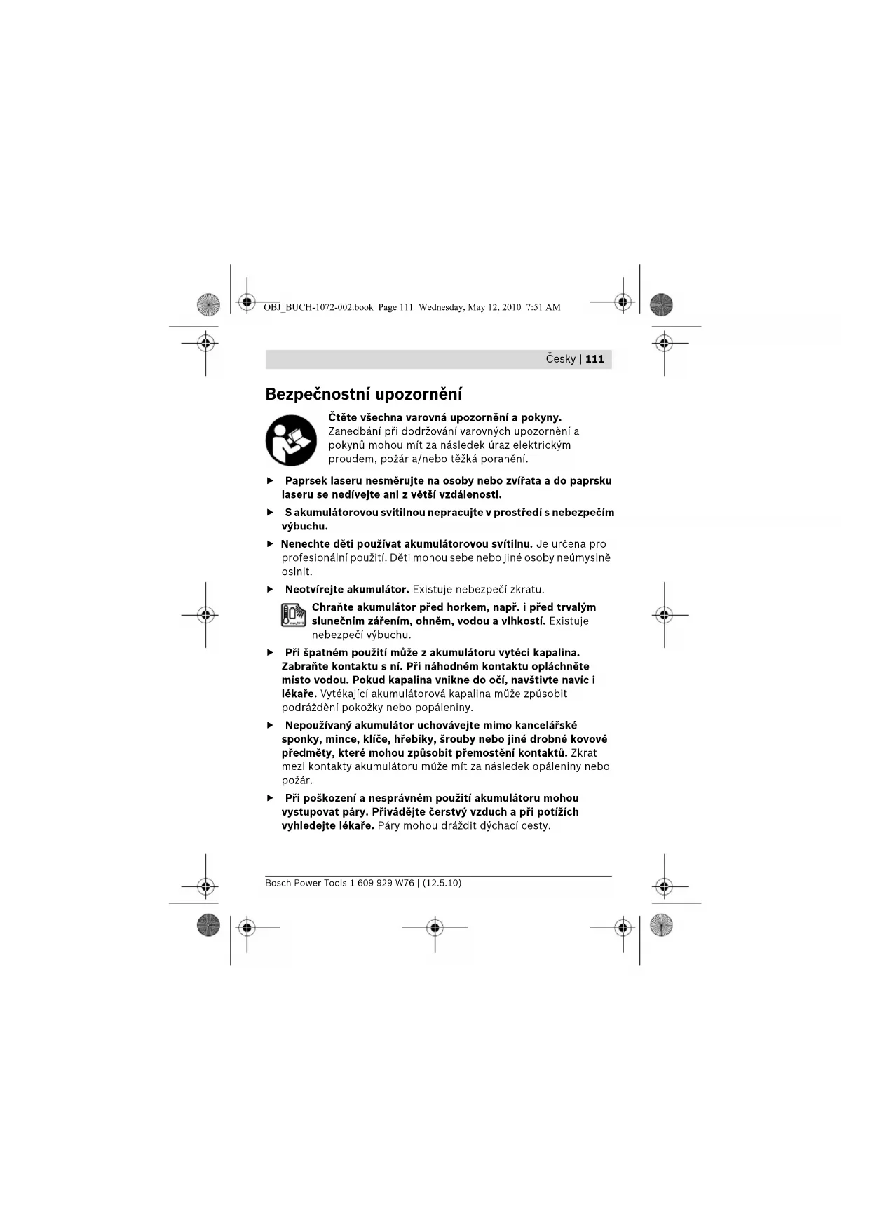 Bezpečnostní upozornění Čtěte všechna varovná upozornění a pokyny. Zanedbání při dodržování varovných upozornění a pokynů mohou mít za následek úraz elektrickým proudem, požár a/nebo těžká poranění. f Paprsek laseru nesměrujte na osoby nebo zvířata a do paprsku laseru se nedívejte ani z větší vzdálenosti. f S akumulátorovou svítilnou nepracujte v prostředí s nebezpečím výbuchu. f Nenechte děti používat akumulátorovou svítilnu. Je určena pro profesionální použití. Děti mohou sebe nebo jiné osoby neúmyslně oslnit. f Neotvírejte akumulátor. Existuje nebezpečí zkratu. Chraňte akumulátor před horkem, např. i před trvalým slunečním zářením, ohněm, vodou a vlhkostí. Existuje nebezpečí výbuchu. f Při špatném použití může z akumulátoru vytéci kapalina. Zabraňte kontaktu s ní. Při náhodném kontaktu opláchněte místo vodou. Pokud kapalina vnikne do očí, navštivte navíc i lékaře. Vytékající akumulátorová kapalina může způsobit podráždění pokožky nebo popáleniny. f Nepoužívaný akumulátor uchovávejte mimo kancelářské sponky, mince, klíče, hřebíky, šrouby nebo jiné drobné kovové předměty, které mohou způsobit přemostění kontaktů. Zkrat mezi kontakty akumulátoru může mít za následek opáleniny nebo požár. f Při poškození a nesprávném použití akumulátoru mohou vystupovat páry. Přivádějte čerstvý vzduch a při potížích vyhledejte lékaře. Páry mohou dráždit dýchací cesty. OBJ_BUCH-1072-002.book Page 111 Wednesday, May 12, 2010 7:51 AM1 609 929 W76 | (12.5.10) Bosch Power Tools 112 | Česky f Akumulátory nabíjejte pouze v nabíječce, která je doporučena výrobcem. Pro nabíječku, která je vhodná pro určitý druh akumulátorů, existuje nebezpečí požáru, je-li používána s jinými akumulátory. f Používejte akumulátor pouze ve spojení s Vaším elektronářadím Bosch. Jen tak bude akumulátor chráněn před nebezpečným přetížením. f Používejte pouze originální akumulátory Bosch s napětím uvedeným na typovém štítku Vašeho elektronářadí. Při používání jiných akumulátorů, např. napodobenin, přepracovaných akumulátorů nebo cizích výrobků, existuje nebezpečí zranění a též věcných škod díky explodujícím akumulátorům. Funkční popis Určené použití Akumulátorová svítilna je určena pro rukou vedené, prostorově omezené osvětlení v suchém prostředí. Zobrazené komponenty Číslování zobrazených komponent se vztahuje na zobrazení akumulátorové svítilny na obrázkové straně. 1 Hlava svítilny 2 Spínač 3 Akumulátor* 4 Odjišťovací tlačítko akumulátoru 5 Úchytka popruhu *Zobrazené nebo popsané příslušenství nepatří k standardnímu obsahu dodávky. Kompletní příslušenství naleznete v našem programu příslušenství. OBJ_BUCH-1072-002.book Page 112 Wednesday, May 12, 2010 7:51 AMČesky | 113 Bosch Power Tools 1 609 929 W76 | (12.5.10) Technická data Montáž Nabíjení akumulátoru (příslušenství) (viz obr. A) f Používejte pouze nabíječky uvedené na straně příslušenství. Jen tyto nabíječky jsou vyladěné na akumulátory Li-ion použité ve Vaší akumulátorové svítilně. Upozornění: Akumulátor se expeduje částečně nabitý. Pro zaručení plného výkonu akumulátoru jej před prvním nasazením v nabíječce zcela nabijte. Akumulátor Li-ion lze bez zkrácení životnosti kdykoli nabít. Přerušení procesu nabíjení nepoškozuje akumulátor. Akumulátor Li-ion je díky „Electronic Cell Protection (ECP)“ chráněn proti hlubokému vybití. U vybitého akumulátoru se ochranným obvodem akumulátorová svítilna vypne. Akumulátorová svítilna GLI 10,8 V-LI Professional Objednací číslo 3 601 D37 U.. Jmenovité napětí V= 10,8 Doba svícení, ca. min 450 Provozní teplota °C –10 ... +40 Skladovací teplota °C –15 ... +50 Hmotnost podle EPTA-Procedure 01/2003 kg 0,3 Dbejte prosím objednacího čísla na typovém štítku Vaší akumulátorové svítilny. Obchodní označení jednotlivých akumulátorových svítilen se mohou měnit. OBJ_BUCH-1072-002.book Page 113 Wednesday, May 12, 2010 7:51 AM1 609 929 W76 | (12.5.10) Bosch Power Tools 114 | Česky Po automatickém vypnutí akumulátorové svítilny už dále netlačte na spínač. Akumulátor se může poškodit. Pro odejmutí akumulátoru 3 stlačte odjišťovací tlačítka 4 a akumulátor vytáhněte dozadu z akumulátorové svítilny. Nepoužívejte přitom žádné násilí. Akumulátor je vybaven kontrolou teploty NTC, která dovolí nabíjení pouze v rozmezí teplot 0 °C a 45 °C. Tím se dosáhne vysoké životnosti akumulátoru. Dbejte upozornění k zpracování odpadu. Provoz Uvedení do provozu Nasazení akumulátoru f Používejte pouze originální akumulátory Li-ion firmy Bosch s napětím uvedeným na typovém štítku Vaší akumulátorové svítilny. Použití jiných akumulátorů může vést ke zraněním a k nebezpečí požáru. Nasaďte nabitý akumulátor 3 do držadla až znatelně zaskočí a přesvědčivě přiléhá k držadlu. Zapnutí – vypnutí f Akumulátorová svítilna vytváří paprsek světla, jež vystupuje z hlavy svítilny 1. Pro uvedení do provozu stlačte spínač 2. Pro vypnutí akumulátorové svítilny spínač 2 znovu stlačte. POZOR OBJ_BUCH-1072-002.book Page 114 Wednesday, May 12, 2010 7:51 AMČesky | 115 Bosch Power Tools 1 609 929 W76 | (12.5.10) Ochrana proti hlubokému vybití Akumulátor Li-ion je díky „Electronic Cell Protection (ECP)“ chráněn proti hlubokému vybití. U vybitého akumulátoru se ochranným obvodem akumulátorová svítilna vypne. Pracovní pokyny Úchytka popruhu (viz obr. B) Pomocí úchytky popruhu 5 můžete zavěsit akumulátorovou svítilnu např. na popruh. Potom máte obě ruce volné a akumulátorová svítilna je kdykoli na dosah ruky. Údržba a 