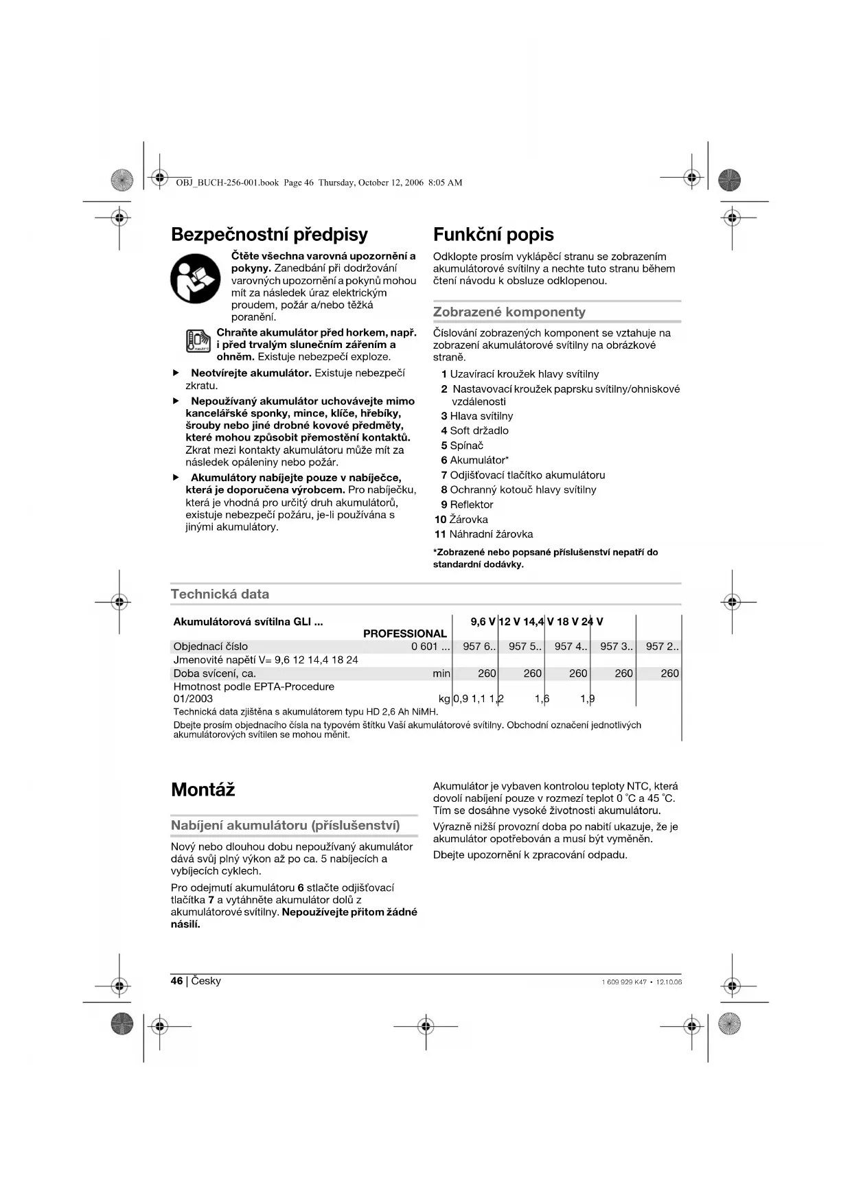 - Nasate ochranný kotouč 8 do uzavíracího kroužku 1 a uzavírací kroužek našroubujte na hlavu svítilny 3. Dbejte přitom na správné usazení. Provoz Uvedení do provozu Nasazení akumulátoru f Používejte pouze originální akumulátory Bosch O-Pack s napětím uvedeným na typovém štítku Vaší akumulátorové svítilny. Použití jiných akumulátorů může vést k poraněním a nebezpečí požáru. Nasate nabitý akumulátor 6 do držadla až znatelně zaskočí a přesvědčivě přiléhá k držadlu. Zapnutí – vypnutí Pro uvedení do provozu posuňte spínač 5 nahoru. Pro vypnutí akumulátorové svítilny posuňte spínač 5 dolů. Změna nastavení reflektoru Hlavu svítilny 3 můžete otočením proti směru hodinových ručiček natočit nahoru o maximálně 90°. Změna paprsku svítilny/změna ohniskové vzdálenosti Otáčením nastavovacího kroužku 2 můžete měnit paprsek svítilny resp. ohniskovou vzdálenost reflektoru. Pracovní pokyny Při nízkých teplotách může být účinnost světla menší a doba svícení kratší. Při použití akumulátorů Bosch NiMH je při teplotách pod – 10 °C k dispozici jen omezená kapacita. Soft držadlo Plocha držadla 4 (soft držadlo) zvyšuje bezpečnost proti vyklouznutí a stará se tak o lepší uchopitelnost a ovladatelnost akumulátorové svítilny. OBJ_BUCH-256-001.book Page 47 Thursday, October 12, 2006 8:05 AM48 | Česky 1 609 929 K47 • 12.10.06 Údržba a servis Údržba a čištění Pokud dojde přes pečlivou výrobu a zkoušky k poruše akumulátorové svítilny, nechte provést opravu v autorizovaném servisním středisku pro elektronářadí Bosch. Při všech dotazech a objednávkách náhradních dílů nezbytně prosím uvádějte 10-místné objednací číslo podle typového štítku akumulátorové svítilny. Servis a poradenství pro zákazníky Technické výkresy a informace k náhradním dílům naleznete na: www.bosch-pt.com Robert Bosch odbytová spol. s r.o. 142 01 Praha 4 – Krč Pod višňovkou 19 ✆ . . . . . . . . . . . . . . . . . . . . . +420 261 300 565 – 6 Fax . . . . . . . . . . . . . . . . . . . . . . . +420 244 401 170 Zpracování odpadů Akumulátorové svítilny, příslušenství a obaly by měly být dodány k opětovnému zhodnocení nepoškozujícímu životní prostředí. Pouze pro země EU: Nevyhazujte akumulátorové svítilny do domovního odpadu! Podle evropské směrnice 2002/96/ES o starých elektrických a elektronických zařízeních a jejím prosazení v národních zákonech musejí být neupotřebitelné akumulátorové svítilny rozebrané shromážděny a dodány k opětovnému zhodnocení nepoškozujícímu životní prostředí. Akumulátory/baterie: Ni-Cd: Nikl-kadmium Pozor: tyto akumulátory obsahují kadmium, vysoce jedovatý těžký kov. Ni-MH: Nikl-metalhydrid Nevyhazujte akumulátory/baterie do domovního odpadu, do ohně nebo vody. Akumulátory/baterie by se měly shromažovat, recyklovat nebo ekologicky zlikvidovat. Pouze pro země EU: Podle směrnice 91/157/EHS musí být vadné nebo vypotřebované akumulátory/baterie recyklovány. Změny vyhrazeny. OBJ_BUCH-256-001.book Page 48 Thursday, October 12, 2006 8:05 AMSlovensky | 491 609 929 K47 • 12.10.06 Bezpečnostné pokyny Prečítajte si všetky Výstražné upo- zornenia a bezpečnostné pokyny. Zanedbanie dodržiavania Výstražných upozornení a pokynov uvedených v na- sledujúcom texte môže ma za násle- dok zásah elektrickým prúdom, spô- sobi požiar a/alebo ažké poranenie. Chráňte akumulátor pred horúčavou, napr. aj pred trvalým žiarením slnečného svetla a pred ohňom. Hrozí nebezpečenstvo výbuchu. f Akumulátor neotvárajte. Hrozí nebezpečenstvo skratovania. f Nepoužívané akumulátory neuschovávajte tak, aby mohli prís do styku s kancelárskymi sponkami, mincami, kúčmi, klincami, skrutkami alebo s inými drobnými kovovými predmetmi, ktoré by mohli spôsobi premostenie kontaktov. Skrat medzi kontaktmi akumulátora môže ma za následok popálenie alebo vznik požiaru. f Akumulátory nabíjajte len v takých nabíjačkách, ktoré odporúča výrobca akumulátora. Ak sa používa nabíjačka, určená na nabíjanie určitého druhu akumulátorov, na nabíjanie iných akumulátorov, hrozí nebezpečenstvo požiaru. Popis fungovania Vyklopte si láskavo vyklápaciu stranu s obrázkami akumulátorovej lampy a nechajte si ju vyklopenú po celý čas, ke čítate tento Návod na používanie. Vyobrazené komponenty Číslovanie jednotlivých komponentov sa vzahuje na vyobrazenie akumulátorovej lampy na grafickej strane tohto Návodu na používanie. 1 Uzavierací krúžok hlavy lampy 2 Krúžok na nastavenie svetelného lúča/ ohniskovej vzdialenosti 3 Hlava lampy 4 Rukovä s mäkkou podložkou tlmiacou vibrácie 5 Vypínač 6 Akumulátor* 7 Tlačidlo uvonenia aretácie akumulátora 8 Ochranné skielko pre hlavu lampy 9 Reflektor 10 Žiarovka 11 Náhradná žiarovka *Zobrazené alebo popísané príslušenstvo nepatrí do základnej výbavy produktu. Technické údaje Montáž Nabíjanie akumulátorov (Príslušenstvo) Nový akumulátor alebo akumulátor, ktorý sa dlhší čas nepoužíval, dáva plný výkon až po cca 5 nabíjacích a vybíjacích cykloch. Ak potrebujete akumulátor 6 vybra, stlačte uvoňovacie tlačidlá 7 a vytiahnite akumulátor z akumulátorovej lampy smerom dole. Nepoužívajte pritom nadmiernu silu. Akumulátor je vybavený tepelnou poistkou NTC, ktorá dovolí nabíjanie akumulátora len v rozsahu teplôt medzi 0 ˚C a 45 ˚C. Vaka tomu sa zabezpečí vyššia životnos akumulátora. Výrazne skrátená prevádzková doba akumulátora po nabití signalizuje, že akumulátor je opotrebovaný a treba ho vymeni za nový. Dodržiavajte pokyny na likvidáciu. Akumulátorová lampa GLI ... PROFESSIONAL 9,6 V 12 V 14,4 V 18 V 24 V Vecné číslo 0 601 ... 957 6.. 957 5.. 957 4.. 957 3.. 957 2.. Menovité na