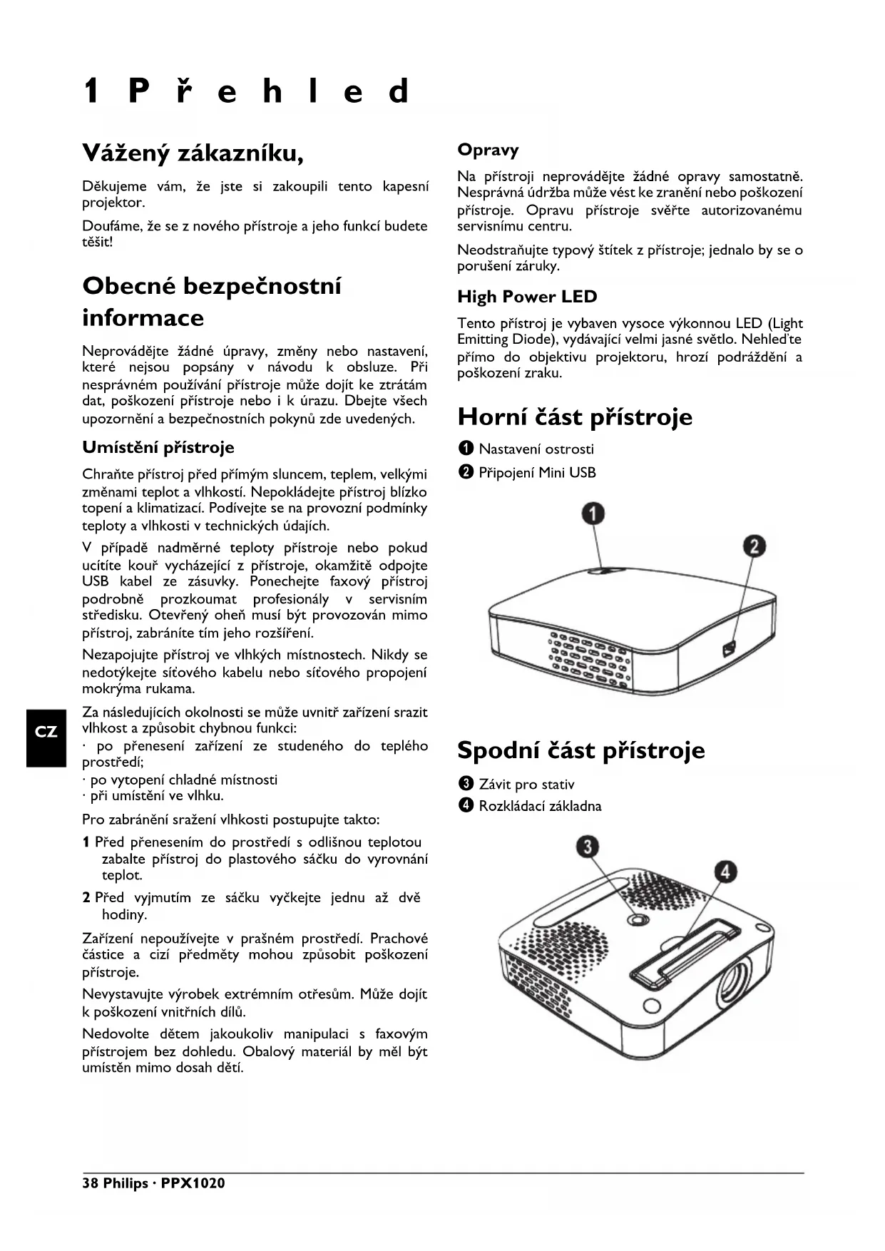 - při umístění ve vlhku. Pro zabránění sražení vlhkosti postupujte takto: 1 Před přenesením do prostředí s odlišnou teplotou zabalte přístroj do plastového sáčku do vyrovnání teplot. 2 Před vyjmutím ze sáčku vyčkejte jednu až dvě hodiny. Zařízení nepoužívejte v prašném prostředí. Zařízení nepoužívejte v prašném prostředí. Prachové částice a cizí předměty mohou způsobit poškození přístroje. Nevystavujte výrobek extrémním otřesům Nevystavujte výrobek extrémním otřesům. Může dojít k poškození vnitřních dílů. Nedovolte dětem jakoukoliv manipulaci s faxovým přístrojem bez dohledu. Nedovolte dětem jakoukoliv manipulaci s faxovým přístrojem bez dohledu. Obalový materiál by měl být umístěn mimo dosah dětí. Opravy Opravy Na přístroji neprovádějte žádné opravy samostatně. Nesprávná údržba může vést ke zranění nebo poškození přístroje. Opravu přístroje svěřte autorizovanému servisnímu centru. Neodstraňujte typový štítek z přístroje; jednalo by se o porušení záruky. High Power LED Tento přístroj je vybaven vysoce výkonnou LED (Light Emitting Diode), vydávající velmi jasné světlo. Nehleďte přímo do objektivu projektoru, hrozí podráždění a poškození zraku. Horní část přístroje ‚ Nastavení ostrosti ƒ Připojení Mini USB PicoPix P1 oben Spodní část přístroje „ Závit pro stativ … Rozkládací základna PicoPix P1 unten ppx1020_manual_13_cz_253345797-b.book Seite 38 Freitag, 17. September 2010 12:15 12Základní ovládání 39