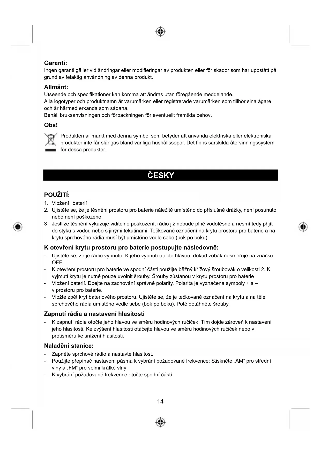 nebo není poškozeno. 3 Jestliže těsnění vykazuje viditelné poškození, rádio již nebude plně vodotěsné a nesmí tedy přijít do styku s vodou nebo s jinými tekutinami. Tečkované označení na krytu prostoru pro baterie a na krytu sprchového rádia musí být umístěno vedle sebe (bok po boku). K otevření krytu prostoru pro baterie postupujte následovně: - Ujistěte se, že je rádio vypnuto. K jeho vypnutí otočte hlavou, dokud zobák nesměřuje na značku OFF. - K otevření prostoru pro baterie ve spodní části použijte běžný křížový šroubovák o velikosti 2. K vyjmutí krytu je nutné pouze uvolnit šrouby. Šrouby zůstanou v krytu prostoru pro baterie - Vložení baterií. Dbejte na zachování správné polarity. Polarita je vyznačena symboly + a – v prostoru pro baterie. - Vložte zpět kryt bateriového prostoru. Ujistěte se, že je tečkované označení na krytu a na těle sprchového rádia umístěno vedle sebe (bok po boku). Poté dotáhněte šrouby. Zapnutí rádia a nastavení hlasitosti - K zapnutí rádia otočte jeho hlavou ve směru hodinových ručiček. Tím dojde zároveň k nastavení jeho hlasitosti. Ke zvýšení hlasitosti otáčejte hlavou ve směru hodinových ručiček nebo v protisměru ke snížení hlasitosti. Naladění stanice: - Zapněte sprchové rádio a nastavte hlasitost. - Použijte přepínač nastavení pásma k vybrání požadované frekvence: Stiskněte „AM” pro střední vlny a „FM” pro velmi krátké vlny. - K vybrání požadované frekvence otočte spodní částí.15 Technické údaje: - Napájení: 3 baterie 1,5 V velikosti AAA - Frekvenční rozsah: FM 88 - 108 MHz (tolerance +/- 1 MHz), AM 540 - 1600 kHz (tolerance +/- 30 kHz) - Hmotnost: 268 g (bez baterií) - Výstupní výkon: 0,2 W - Reproduktor: Širokopásmový reproduktor, vodotěsný Bezpečnostní opatření: Abyste snížili riziko úrazu elektrickým šokem, měl by být tento výrobek otevřen POUZE autorizovaným technikem, je-li to nezbytné. V případě, že dojde k závadě, odpojte výrobek ze sítě a od jiných zařízení. Výrobek nevystavujte vodě nebo vlhkosti. Údržba: K čištění používejte pouze suchý hadřík. Nepoužívejte čisticí rozpouštědla ani abrazivní prostředky. Záruka: Jakékoli změny, modifikace nebo poškození zařízení v důsledku nesprávného zacházení se zařízením ruší platnost záruční smlouvy. Obecné upozornění: Design a specifikace výrobku mohou být změněny bez předchozího upozornění. Všechna loga a obchodní názvy jsou registrované obchodní značky příslušných vlastníků a jsou chráněny zákonem. Pro budoucí použití uschovejte tento návod a obal. Upozornění: Tento výrobek je označen tímto symbolem. To znamená, že se s výrobkem musí zacházet jako s nebezpečným elektrickým a elektronickým odpadem a nelze jej po skončení životnosti vyhazovat s běžným domácím odpadem. Pro likvidaci těchto výrobků existují zvláštní sběrná střediska.