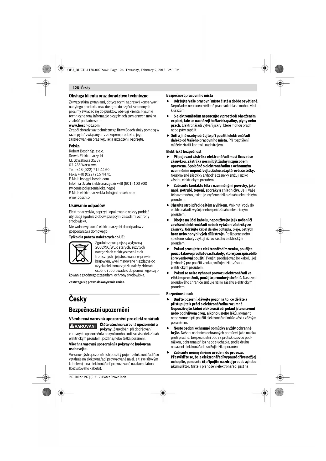 10000 – 25000 10000 – 25000 Předvolba počtu otáček z z Údaje platí pro jmenovité napětí [U] 230 V. U odlišných napětí a podle země specifických provedení se mohou tyto údaje lišit. OBJ_BUCH-1178-002.book Page 128 Thursday, February 9, 2012 3:50 PMČesky | 129 Bosch Power Tools 2 610 022 197 | (9.2.12) Informace o hluku a vibracích Naměřené hodnoty hluku zjištěny podle EN 60745. Hodnocená hladina hluku stroje A činí typicky: hladina akustického tlaku 86 dB(A); hladina akustického výkonu 97 dB(A). Nepřesnost K=3 dB. Noste chrániče sluchu! V těchto pokynech uvedená úroveň vibrací byla změřena podle měřících metod normovaných v EN 60745 a může být použita pro vzájemné porovnání elektronářadí. Hodí se i pro předběžný odhad zatížení vibracemi. Uvedená úroveň vibrací reprezentuje hlavní použití elektronářadí. Pokud ovšem bude elektronářadí nasazeno pro jiná použití, s odlišnými nasazovacími nástroji nebo s nedostatečnou údržbou, může se úroveň vibrací lišit. To může zatíženi vibracemi po celou pracovní dobu zřetelně zvýšit. Pro přesný odhad zatížení vibracemi by měly být zohledněny i doby, v nichž je stroj vypnutý nebo sice běží, ale fakticky není nasazen. To může zatíženi vibracemi po celou pracovní dobu zřetelně zredukovat. Stanovte dodatečná bezpečnostní opatření k ochraně obsluhy před účinky vibrací jako např.: údržba elektronářadí a nasazovacích nástrojů, udržování teplých rukou, organizace pracovních procesů. Prohlášení o shodě Prohlašujeme v plné naší zodpovědnosti, že v odstavci „Technická data“ popsaný výrobek je v souladu s následujícími normami nebo normativními dokumenty: EN 60745 podle ustanovení směrnic 2011/65/EU, 2004/108/ES, 2006/42/ES. Technická dokumentace (2006/42/ES) u: Robert Bosch GmbH, PT/ETM9, D-70745 Leinfelden-Echterdingen Robert Bosch GmbH, Power Tools Division D-70745 Leinfelden-Echterdingen
