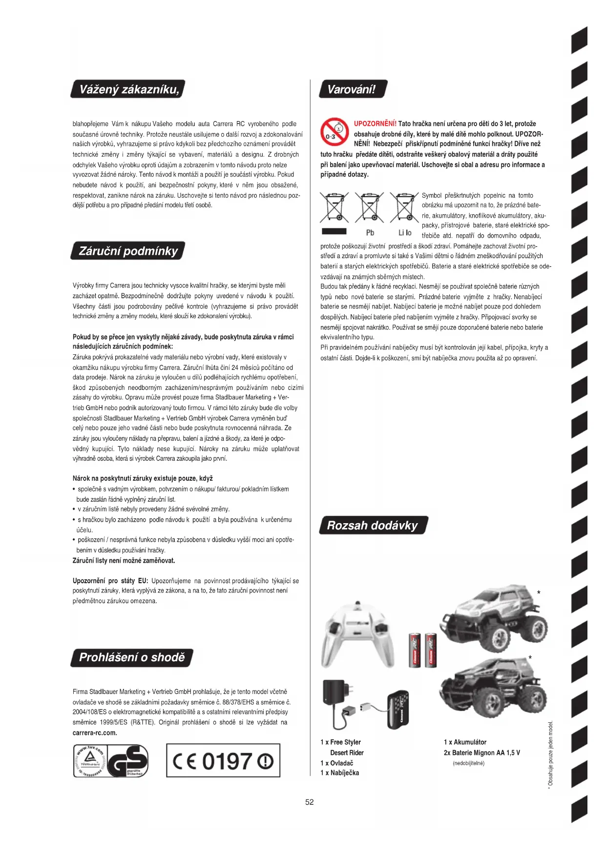 - poškození / nesprávná funkce nebyla způsobena v důsledku vyšší moci ani opotře- bením v důsledku používání hračky. Záruční listy není možné zaměňovat. Upozornění pro státy EU: Upozorňujeme na povinnost prodávajícího týkající se poskytnutí záruky, která vyplývá ze zákona, a na to, že tato záruční povinnost není předmětnou zárukou omezena. Prohlášení o shodě Firma Stadlbauer Marketing + Vertrieb GmbH prohlašuje, že je tento model včetně ovladače ve shodě se základními požadavky směrnice č. 88/378/EHS a směrnice č. 2004/108/ES o elektromagnetické kompatibilitě a s ostatními relevantními předpisy směrnice 1999/5/ES (R&TTE). Originál prohlášení o shodě si lze vyžádat na carrera-rc.com. Varování! UPOZORNĚNÍ! Tato hračka není určena pro děti do 3 let, protože obsahuje drobné díly, které by malé dítě mohlo polknout. UPOZOR- NĚNÍ! Nebezpečí přiskřípnutí podmíněné funkcí hračky! Dříve než tuto hračku předáte dítěti, odstraňte veškerý obalový materiál a dráty použité při balení jako upevňovací materiál. Uschovejte si obal a adresu pro informace a případné dotazy. Symbol přeškrtnutých popelnic na tomto obrázku má upozornit na to, že prázdné bate- rie, akumulátory, knoflíkové akumulátory, aku- packy, přístrojové baterie, staré elektrické spo- třebiče atd. nepatří do domovního odpadu, protože poškozují životní prostředí a škodí zdraví. Pomáhejte zachovat životní pro- středí a zdraví a promluvte si také s Vašimi dětmi o řádném zneškodňování použitých baterií a starých elektrických spotřebičů. Baterie a staré elektrické spotřebiče se ode- vzdávají na známých sběrných místech. Budou tak předány k řádné recyklaci. Nesmějí se používat společně baterie různých typů nebo nové baterie se starými. Prázdné baterie vyjměte z hračky. Nenabíjecí baterie se nesmějí nabíjet. Nabíjecí baterie je možné nabíjet pouze pod dohledem dospělých. Nabíjecí baterie před nabíjením vyjměte z hračky. Připojovací svorky se nesmějí spojovat nakrátko. Používat se smějí pouze doporučené baterie nebo baterie ekvivalentního typu. Při pravidelném používání nabíječky musí být kontrolován její kabel, přípojka, kryty a ostatní části. Dojde-li k poškození, smí být nabíječka znovu použita až po opravení. Rozsah dodávky 1 x Akumulátor 2x Baterie Mignon AA 1,5 V (nedobíjitelné) 1 x Free Styler Desert Rider 1 x Ovladač 1 x Nabíječka53