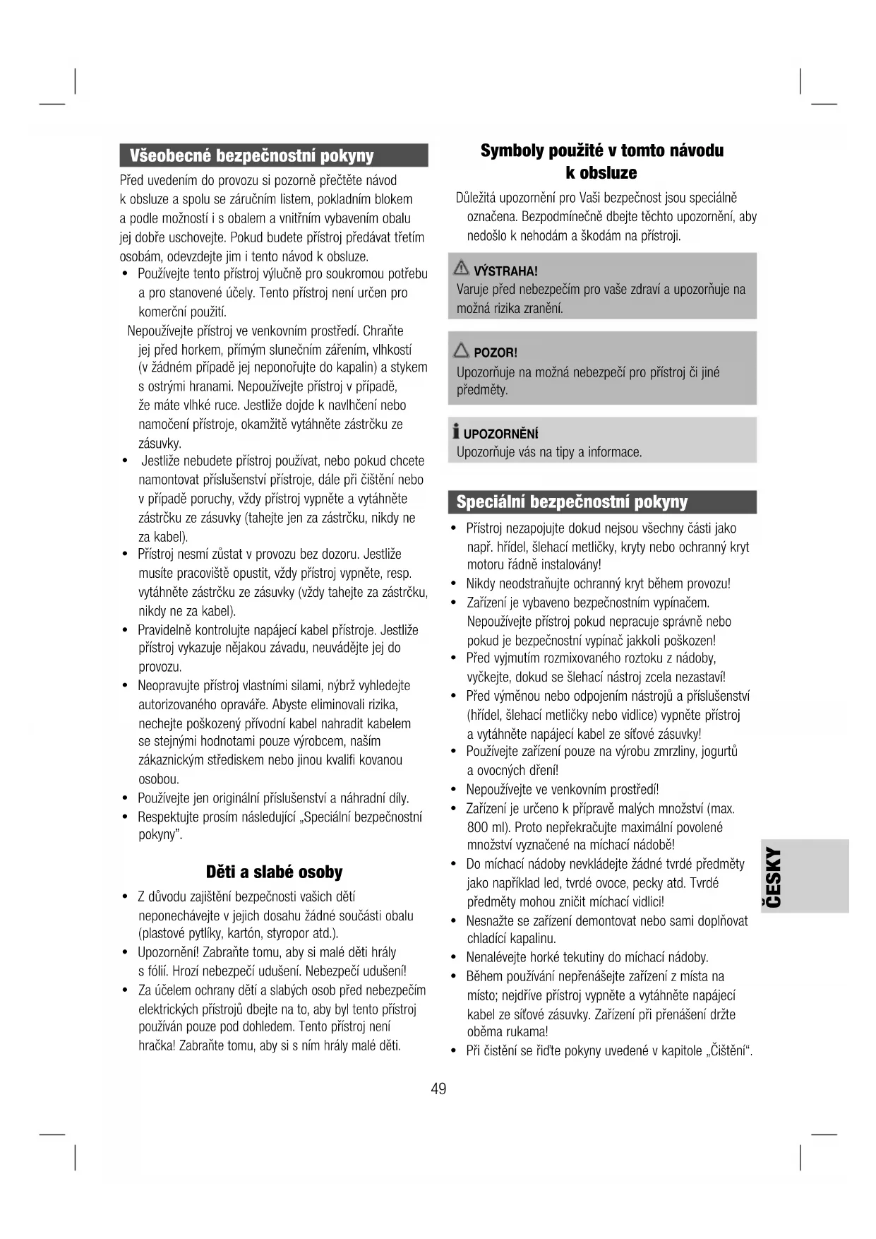Míchací nástroj 12 Bezpečnostní vypínač Vybalení přístroje Vyjměte přístroj a příslušenství z krabice. Obalový materiál nevyhazujte; uschovejte jej společně se záručním listem. V případě potřeby použijte originální obalový materiál.