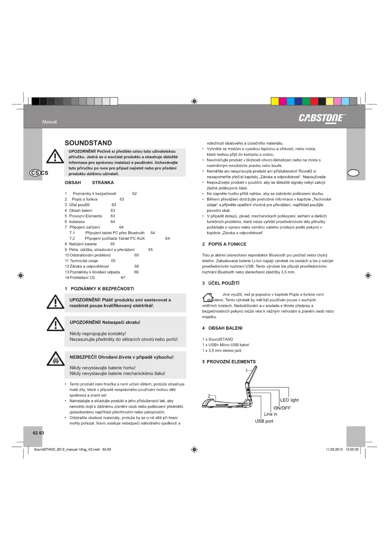 - nesvítí -bateriejezcelanabitá SoundSTAND_2012_manual 14lng_V2.indd 64-65 11.02.2013 15:00:3066 67 CS CS Manuál Bluetooth V2.1 + EDR Typbaterie Li-Ion 3.7V DC, 850 mAh Připojení Micro-USB, 3.5 mm STEREO impedance 4Ω Ø Provozní doba 10 h 12 ZáRUKA A ODPOVĚDNOST
