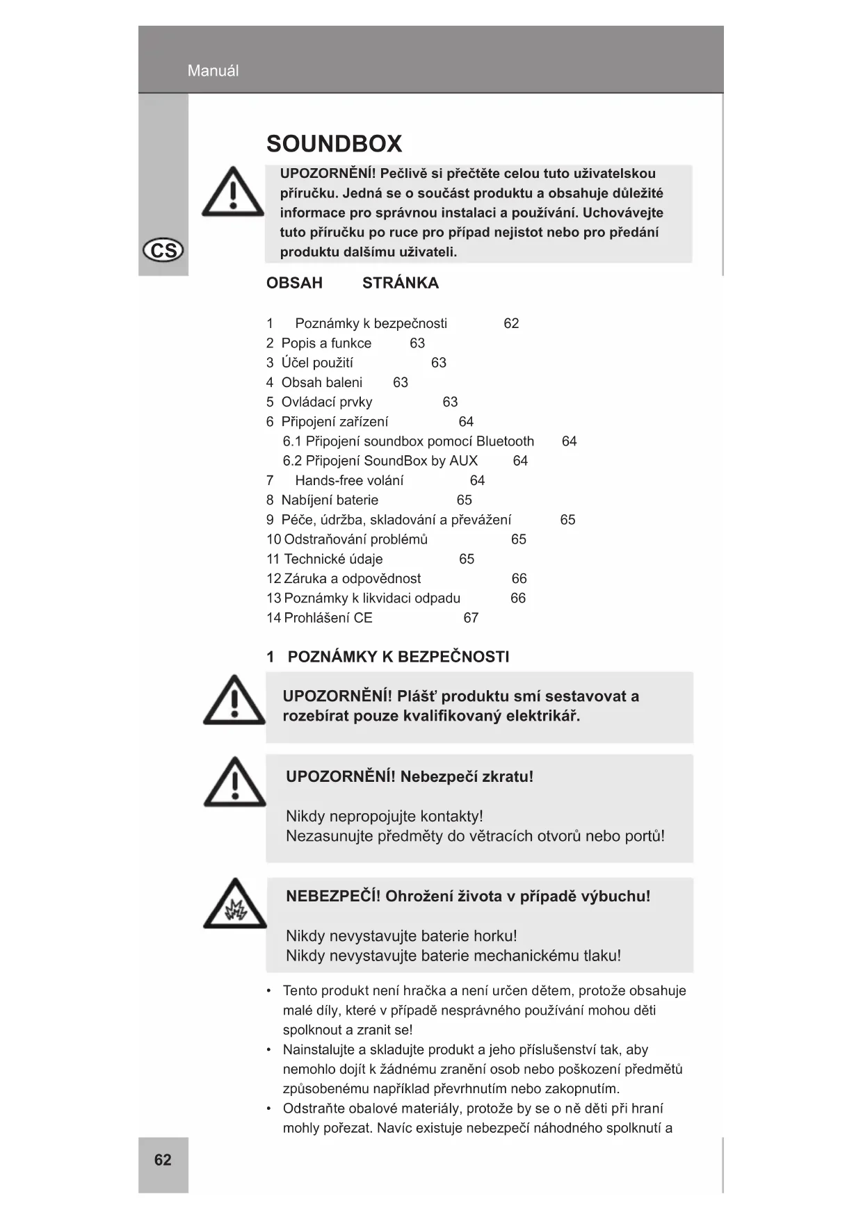 1 Poznámkykbezpečnosti 62 2 Popis a funkce 63 3Účelpoužití 63 4 Obsah baleni 63 5Ovládacíprvky 63 6Připojenízařízení 64 6.1PřipojenísoundboxpomocíBluetooth 64 6.2PřipojeníSoundBoxbyAUX 64 7 Hands-freevolání 64 8Nabíjeníbaterie 65 9Péče,údržba,skladováníapřevážení 65 10Odstraňováníproblémů 65 11Technickéúdaje 65 12Zárukaaodpovědnost 66 13Poznámkyklikvidaciodpadu 66 14ProhlášeníCE 67