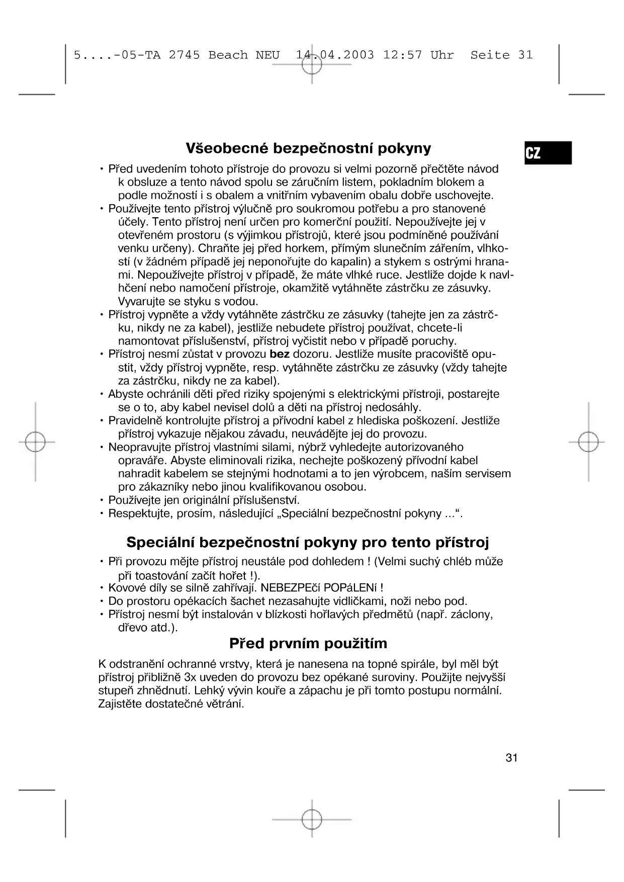 K odstraněni ochranné vrstvy, ktera je nanesena na topné spirále, byl měl byt prístroj príblžné 3x uveden do provozu bez opěkané suroviny. Použijte nejvyší stupeř zhnednuti. Lehký vyvin kouře a zápachu je pri totom postupu normální. Zajistěte dostatečné vetrání.