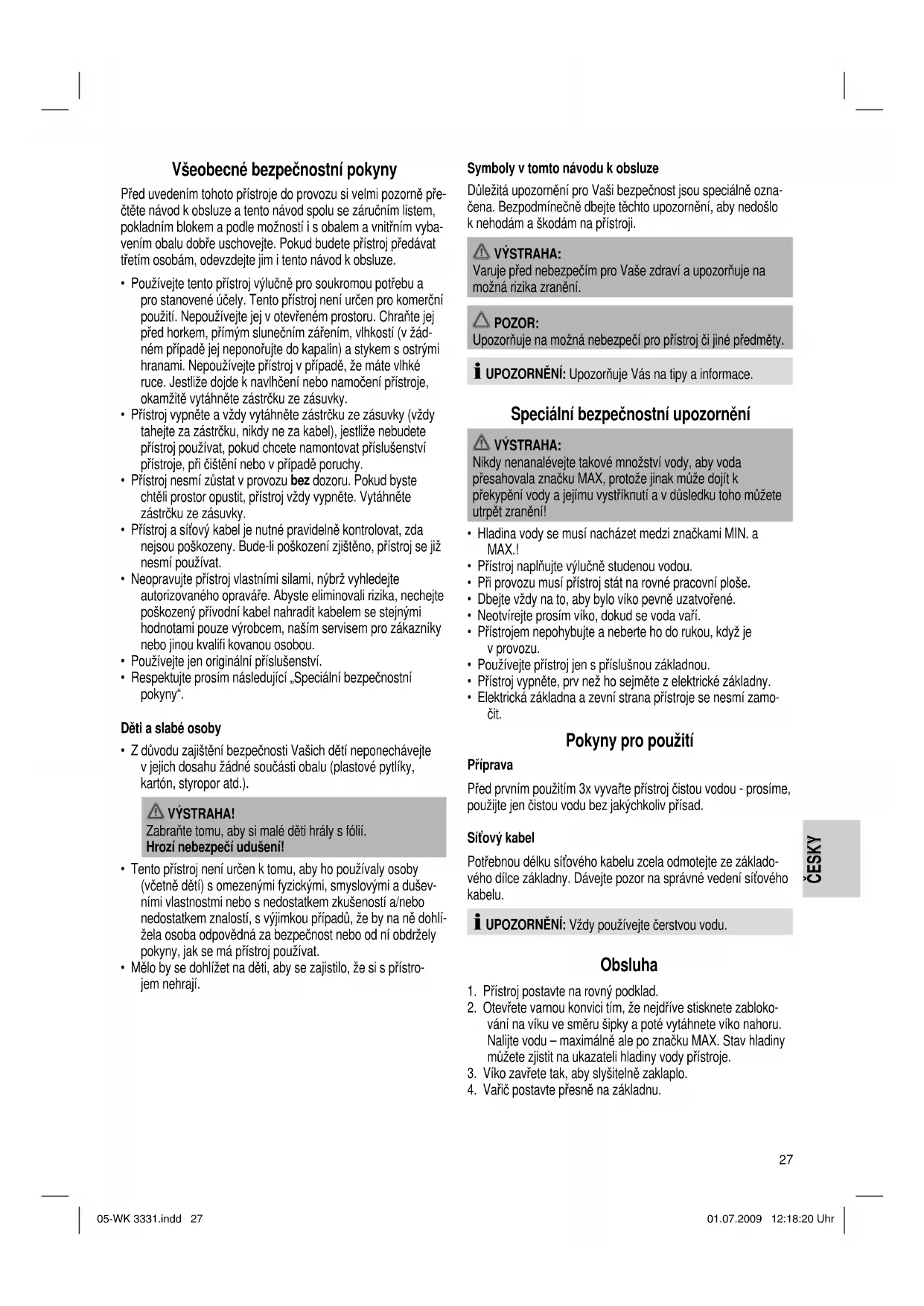 - Mělo by se dohlížet na děti, aby se zajistilo, že si s přístro- jem nehrají. Symboly v tomto návodu k obsluze Důležitá upozornění pro Vaši bezpečnost jsou speciálně ozna- čena. Bezpodmínečně dbejte těchto upozornění, aby nedošlo k nehodám a škodám na přístroji. VÝSTRAHA: Varuje před nebezpečím pro Vaše zdraví a upozorňuje na možná rizika zranění. POZOR: Upozorňuje na možná nebezpečí pro přístroj či jiné předměty. UPOZORNĚNÍ: Upozorňuje Vás na tipy a informace. Speciální bezpečnostní upozornění VÝSTRAHA: Nikdy nenanalévejte takové množství vody, aby voda přesahovala značku MAX, protože jinak může dojít k překypění vody a jejímu vystříknutí a v důsledku toho můžete utrpět zranění!