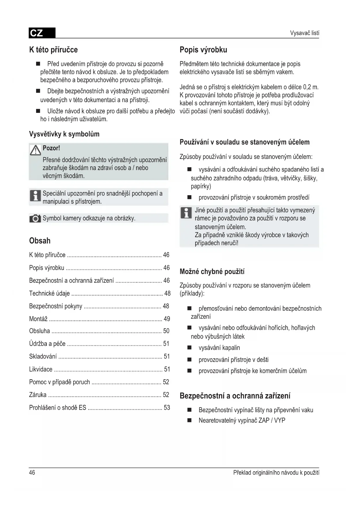 - Vysavač listí Popis výrobku Předmětem této technické dokumentace je popis elektrického vysavače listí se sběrným vakem. Jedná se o přístroj s elektrickým kabelem o délce 0,2 m. K provozování tohoto přístroje je potřeba prodlužovací kabel s ochranným kontaktem, který musí být odolný vůči počasí (není součástí dodávky). Používání v souladu se stanoveným účelem Způsoby používání v souladu se stanoveným účelem: vysávání a odfoukávání suchého spadaného listí a suchého zahradního odpadu (tráva, větvičky, šišky, papírky) provozování přístroje v soukromém prostředí Jiné použití a použití přesahující takto vymezený rámec je považováno za použití v rozporu se stanoveným účelem. Za případně vzniklé škody výrobce v takových případech neručí! Možné chybné použití Způsoby používání v rozporu se stanoveným účelem (příklady): přemosťování nebo demontování bezpečnostních zařízení vysávání nebo odfoukávání hořících, hořlavých nebo výbušných látek vysávání kapalin provozování přístroje v dešti provozování přistroje ke komerčním účelům Bezpečnostní a ochranná zařízení Bezpečnostní vypínač lišty na připevnění vaku Nearetovatelný vypínač ZAP / VYP K této příručce Před uvedením přístroje do provozu si pozorně přečtěte tento návod k obsluze. Je to předpokladem bezpečného a bezporuchového provozu přístroje. Dbejte bezpečnostních a výstražných upozornění uvedených v této dokumentaci a na přístroji. Uložte návod k obsluze pro další potřebu a předejto ho i následným uživatelům. Vysvětivky k symbolům Pozor! Přesné dodržování těchto výstražných upozornění zabraňuje škodám na zdraví osob a / nebo věcným škodám. Speciální upozornění pro snadnější pochopení a manipulaci s přístrojem. Symbol kamery odkazuje na obrázky. Obsah K této příručce p. 46