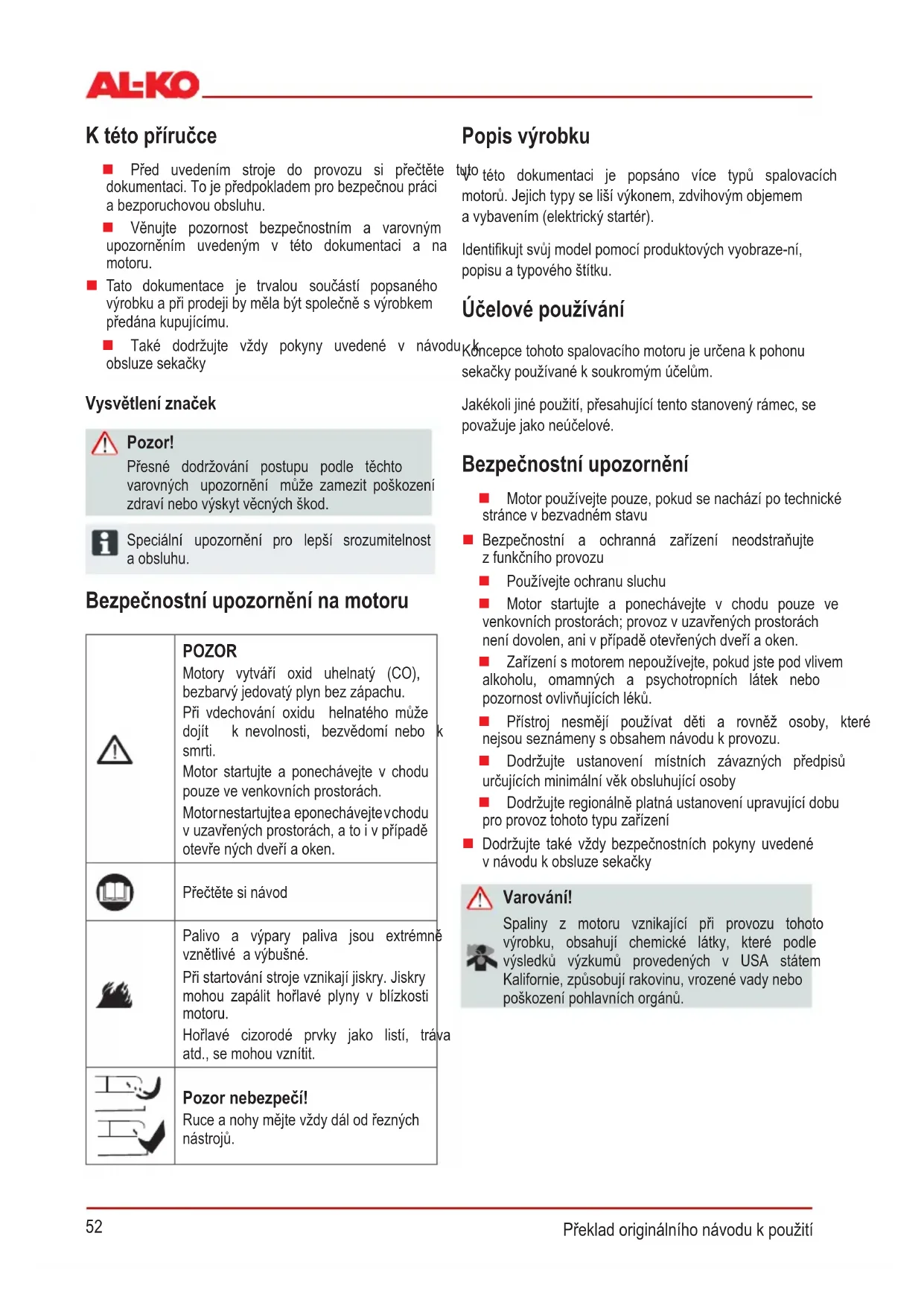 Bezpečnostní upozornění na motoru