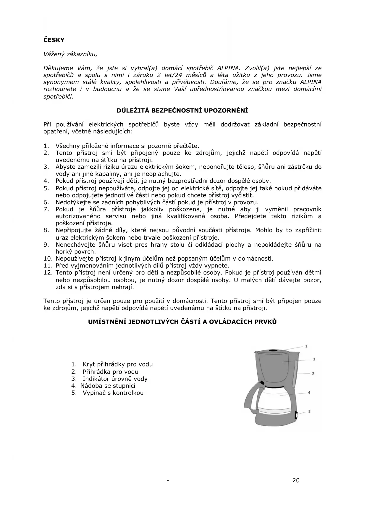Vážený zákazníku, Děkujeme Vám, že jste si vybral(a) domácí spotřebič ALPINA. Zvolil(a) jste nejlepší ze spotřebičů a spolu s nimi i záruku 2 let/24 měsíců a léta užitku z jeho provozu. Jsme synonymem stálé kvality, spolehlivosti a přívětivosti. Doufáme, že se pro značku ALPINA rozhodnete i v budoucnu a že se stane Vaší upřednostňovanou značkou mezi domácími spotřebiči. DŮLEŽITÁ BEZPEČNOSTNÍ UPOZORNĚNÍ Při používání elektrických spotřebičů byste vždy měli dodržovat základní bezpečnostní opatření, včetně následujících: