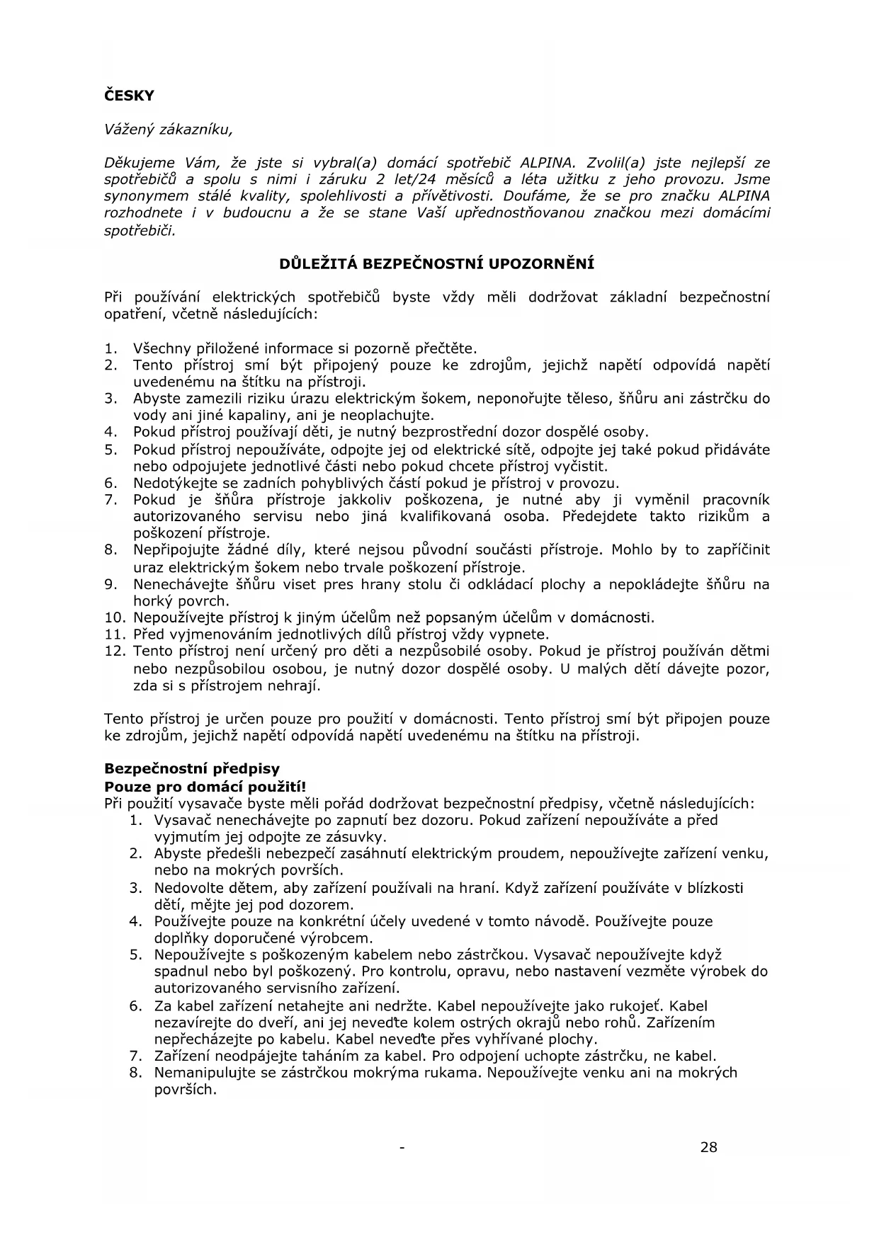 Vážený zákazníku, Děkujeme Vám, že jste si vybral(a) domácí spotřebič ALPINA. Zvolil(a) jste nejlepší ze spotřebičů a spolu s nimi i záruku 2 let/24 měsíců a léta užitku z jeho provozu. Jsme synonymem stálé kvality, spolehlivosti a přívětivosti. Doufáme, že se pro značku ALPINA rozhodnete i v budoucnu a že se stane Vaší upřednostňovanou značkou mezi domácími spotřebiči. DŮLEŽITÁ BEZPEČNOSTNÍ UPOZORNĚNÍ Při používání elektrických spotřebičů byste vždy měli dodržovat základní bezpečnostní opatření, včetně následujících: