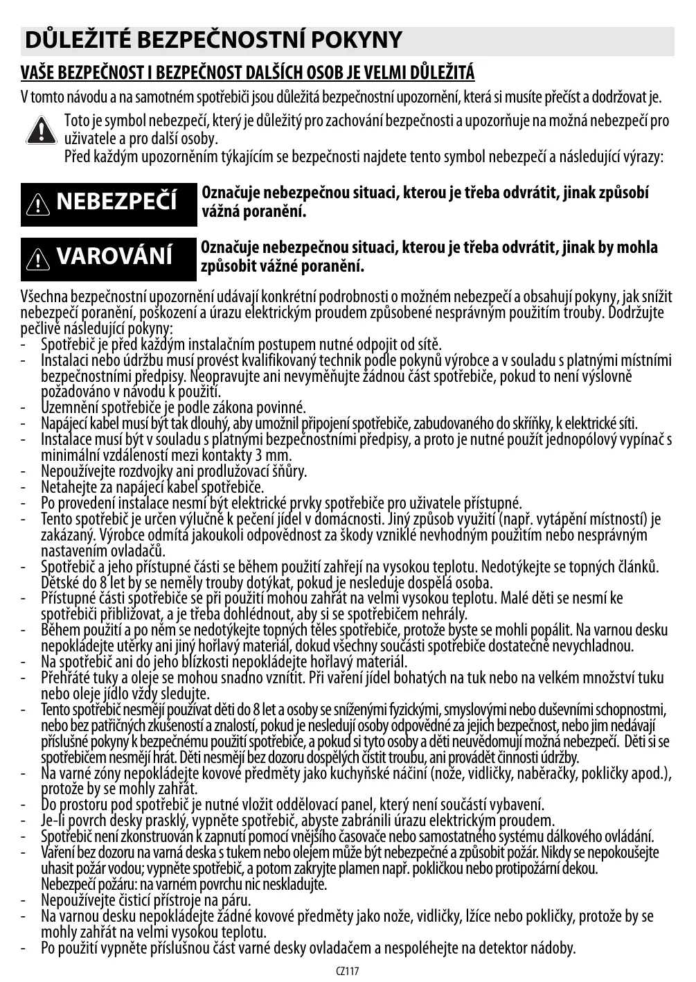 VAŠE BEZPEČNOST I BEZPEČNOST DALŠÍCH OSOB JE VELMI DŮLEŽITÁ V tomto návodu a na samotném spotřebiči jsou důležitá bezpečnostní upozornění, která si musíte přečíst a dodržovat je. Toto je symbol nebezpečí, který je důležitý pro zachování bezpečnosti a upozorňuje na možná nebezpečí pro uživatele a pro další osoby. Před každým upozorněním týkajícím se bezpečnosti najdete tento symbol nebezpečí a následující výrazy: NEBEZPEČÍ Označuje nebezpečnou situaci, kterou je třeba odvrátit, jinak způsobí vážná poranění. VAROVÁNÍ Označuje nebezpečnou situaci, kterou je třeba odvrátit, jinak by mohla způsobit vážné poranění. Všechna bezpečnostní upozornění udávají konkrétní podrobnosti o možném nebezpečí a obsahují pokyny, jak snížit nebezpečí poranění, poškození a úrazu elektrickým proudem způsobené nesprávným použitím trouby. Dodržujte pečlivě následující pokyny: - Spotřebič je před každým instalačním postupem nutné odpojit od sítě. - Instalaci nebo údržbu musí provést kvalifikovaný technik podle pokynů výrobce a v souladu s platnými místními bezpečnostními předpisy. Neopravujte ani nevyměňujte žádnou část spotřebiče, pokud to není výslovně požadováno v návodu k použití. - Uzemnění spotřebiče je podle zákona povinné. - Napájecí kabel musí být tak dlouhý, aby umožnil připojení spotřebiče, zabudovaného do skříňky, k elektrické síti. - Instalace musí být v souladu s platnými bezpečnostními předpisy, a proto je nutné použít jednopólový vypínač s minimální vzdáleností mezi kontakty 3 mm. - Nepoužívejte rozdvojky ani prodlužovací šňůry. - Netahejte za napájecí kabel spotřebiče. - Po provedení instalace nesmí být elektrické prvky spotřebiče pro uživatele přístupné. - Tento spotřebič je určen výlučně k pečení jídel v domácnosti. Jiný způsob využití (např. vytápění místností) je zakázaný. Výrobce odmítá jakoukoli odpovědnost za škody vzniklé nevhodným použitím nebo nesprávným nastavením ovladačů. - Spotřebič a jeho přístupné části se během použití zahřejí na vysokou teplotu. Nedotýkejte se topných článků. Dětské do 8 let by se neměly trouby dotýkat, pokud je nesleduje dospělá osoba. - Přístupné části spotřebiče se při použití mohou zahřát na velmi vysokou teplotu. Malé děti se nesmí ke spotřebiči přibližovat, a je třeba dohlédnout, aby si se spotřebičem nehrály. - Během použití a po něm se nedotýkejte topných těles spotřebiče, protože byste se mohli popálit. Na varnou desku nepokládejte utěrky ani jiný hořlavý materiál, dokud všechny součásti spotřebiče dostatečně nevychladnou. - Na spotřebič ani do jeho blízkosti nepokládejte hořlavý materiál. - Přehřáté tuky a oleje se mohou snadno vznítit. Při vaření jídel bohatých na tuk nebo na velkém množství tuku nebo oleje jídlo vždy sledujte. - Tento spotřebič nesmějí používat děti do 8 let a osoby se sníženými fyzickými, smyslovými nebo duševními schopnostmi, nebo bez patřičných zkušeností a znalostí, pokud je nesledují osoby odpovědné za jejich bezpečnost, nebo jim nedávají příslušné pokyny k bezpečnému použití spotřebiče, a pokud si tyto osoby a děti neuvědomují možná nebezpečí. Děti si se spotřebičem nesmějí hrát. Děti nesmějí bez dozoru dospělých čistit troubu, ani provádět činnosti údržby. - Na varné zóny nepokládejte kovové předměty jako kuchyňské náčiní (nože, vidličky, naběračky, pokličky apod.), protože by se mohly zahřát. - Do prostoru pod spotřebič je nutné vložit oddělovací panel, který není součástí vybavení. - Je-li povrch desky prasklý, vypněte spotřebič, abyste zabránili úrazu elektrickým proudem. - Spotřebič není zkonstruován k zapnutí pomocí vnějšího časovače nebo samostatného systému dálkového ovládání. - Vaření bez dozoru na varná deska s tukem nebo olejem může být nebezpečné a způsobit požár. Nikdy se nepokoušejte uhasit požár vodou; vypněte spotřebič, a potom zakryjte plamen např. pokličkou nebo protipožární dekou. Nebezpečí požáru: na varném povrchu nic neskladujte. - Nepoužívejte čisticí přístroje na páru. - Na varnou desku nepokládejte žádné kovové předměty jako nože, vidličky, lžíce nebo pokličky, protože by se mohly zahřát na velmi vysokou teplotu. - Po použití vypněte příslušnou část varné desky ovladačem a nespoléhejte na detektor nádoby. CZ117 RADY K OCHRANĚ ŽIVOTNÍHO PROSTŘEDÍ Likvidace obalového materiálu Obal je ze 100% recyklovatelného materiálu a je označen recyklačním symbolem ( podle platných místních předpisů. ). Obalový materiál proto nevyhazujte s domácím odpadem, ale zlikvidujte ho Likvidace spotřebiče Tento spotřebič je označen v souladu s evropskou směrnicí 2002/96/ES o likvidaci elektrického a elektronického zařízení (WEEE). Zajištěním správné likvidace tohoto výrobku pomůžete zabránit případným negativním důsledkům na životní prostředí a lidské zdraví. Symbol na spotřebiči nebo příslušných dokladech udává, že tento výrobek nepatří do domácího odpadu, ale je nutné ho odevzdat do příslušného sběrného centra pro recyklaci elektrických a elektronických zařízení. Úspora energie Chcete-li dosáhnout nejlepších výsledků: