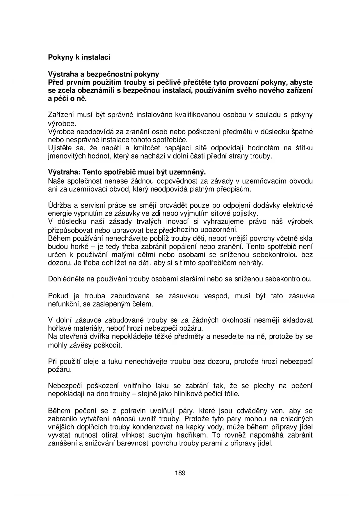 190Instalace vestavné trouby DŮLEŽITÉ: Zařízení musí být správně instalováno kvalifikovanou osobou v souladu s pokyny výrobce. Po odpojení napájení je nezbytné provést údržbu a servis. ELEKTRICKÉ ZAPOJENÍ: Před připojením spotřebiče k napájecí síti se ujistěte, že: