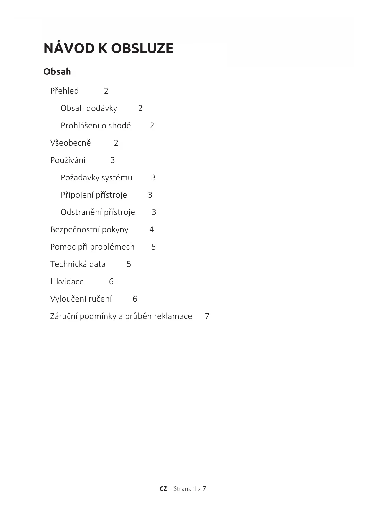 Service Center (o seu n.º RMA) Kopernikusstraße 12-14 D-49377 Vechta Contacto: E-mail (assistência técnica): support@intenso-internaonal.de E-mail (número RMA): rma@intenso-internaonal.de Internet: www.intenso-internaonal.de Linha de apoio da assistência: +49 (0) 900 –1 50 40 30 (0,39 € / min. de rede xa alemã. Preços de redes móveis podem variar.) Processo de reclamaçãoNÁVOD K OBSLUZE CZ - Strana 1 z 7 Obsah Přehled 2 Obsah dodávky 2 Prohlášení o shodě 2 Všeobecně 2 Používání 3 Požadavky systému 3 Připojení přístroje 3 Odstranění přístroje 3 Bezpečnostní pokyny 4 Pomoc při problémech 5 Technická data 5 Likvidace 6 Vyloučení ručení 6 Záruční podmínky a průběh reklamace 7CZ - Strana 2 z 7 Přečtěte si pečlivě tento návod a respektujte všechny pokyny uvedené v tomto návodu, aby se zaručila dlouhodobá životnost a spolehlivé používání přístroje. Uschovejte tento návod na dosah ruky a odevzdejte jej jiným uživatelům přístroje. K tomuto návodu VŠEOBECNĚ Prohlášení o shodě Symbol CE prokazuje, že tento produkt splňuje požadavky všech směrnic EU pro tento produkt. Obsah dodávky PŘEHLED Hlavní úkol tohoto externího pevného disku spočívá v ukládání dat z počítačů, notebooků, ultrabooků nebo počítačů MAC. Tento produkt není naplánovaný ke komerčnímu používání nebo na medicínské a speciální účely, při kterých může výpadek produktu způsobit zranění, smrtelné úrazy nebo výrazné věcné škody. V případě používání, které neodpovídá používání podle předpisů, zaniká záruka. Otevření a také přestavba přístroje a používání přídavných přístrojů a dílů příslušenství, které nebyly schválené naší rmou, jsou zakázány. Nepoužívejte přístroj za extrémních okolních podmínek a respektujte bezpečnostní předpisy. Nerespektování informací a bezpečnostních pokynů v tomto návodu se považuje za nedodržování používání podle předpisů a může vést k zániku záruky a zraněním osob nebo věcným škodám. Používání podle předpisů