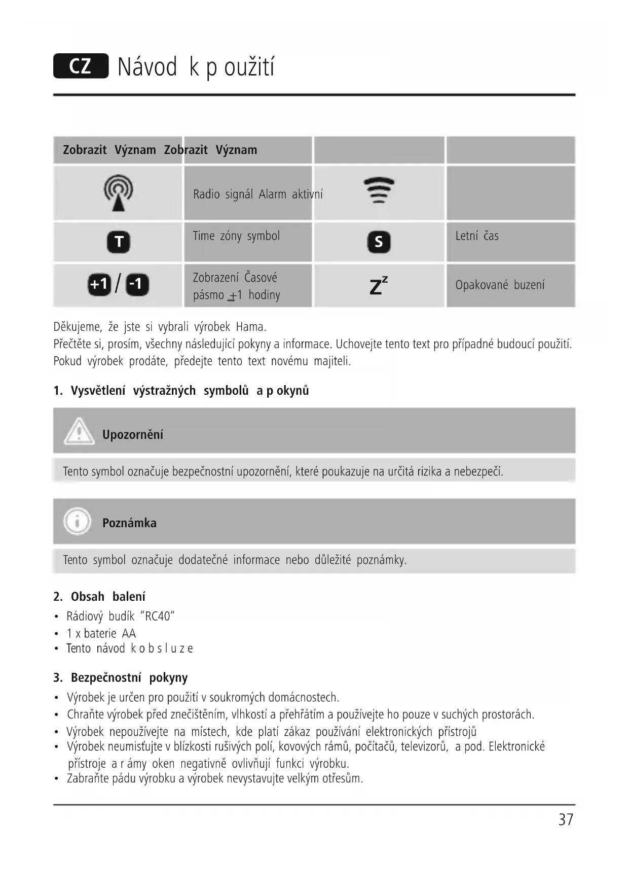 z Opakované buzeníDěkujeme, že jste si vybrali výrobek Hama. Přečtěte si, prosím, všechny následující pokyny ainformace. Uchovejte tento text propřípadné budoucí použití. Pokud výrobek prodáte, předejte tento text novému majiteli.1. Vysvětlení výstražných symbolů apokynůUpozornění Tento symbol označuje bezpečnostní upozornění, které poukazuje na určitá rizika anebezpečí. PoznámkaTento symbol označuje dodatečné informace nebo důležité poznámky.2. Obsah balení• Rádiový budík “RC40“• 1xbaterie AA• Tento návod kobsluze3. Bezpečnostní pokyny • Výrobek je určen propoužití vsoukromých domácnostech.