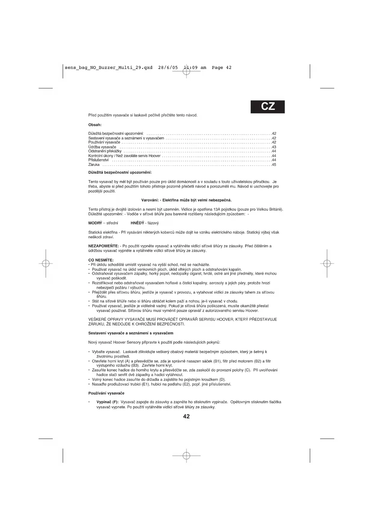 vysavaã používat. SíÈovou šÀÛru musí vymûnit pouze opraváfi z autorizovaného servisu Hoover.