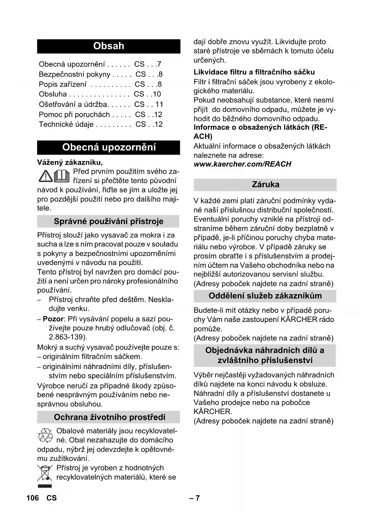 • Segítség üzemzavar esetén A hálózati kábel feltekerése nem működik Víz folyik ki a készülékből Csökkenő szívóteljesítmény J 1 104 HU– 13 A műszaki adatok a kinyitható oldalon talál- hatók. Az ott használt szimbólumok ma- gyarázata után. A műszaki adatok módosításának jogát fenntartjuk! Műszaki adatok Feszültség Teljesítmény P névl Teljesítmény P max A készülék dugalj max. csatla- kozási teljesítménye Hálózati biztosító (lomha) Tartály térfogata Vízfelvétel fogantyúval Vízfelvétel padlófejjel Hálózati kábel Hangnyomás szint (EN 60704- 2-1) Tartozékok nélküli súly 105HU– 7 Vážený zákazníku, Před prvním použitím svého za- řízení si přečtěte tento původní návod k používání, řiďte se jím a uložte jej pro pozdější použití nebo pro dalšího maji- tele. Přístroj slouží jako vysavač za mokra i za sucha a lze s ním pracovat pouze v souladu s pokyny a bezpečnostními upozorněními uvedenými v návodu na použití. Tento přístroj byl navržen pro domácí pou- žití a není určen pro nároky profesionálního používání. – Přístroj chraňte před deštěm. Neskla- dujte venku. – Pozor: Při vysávání popelu a sazí pou- žívejte pouze hrubý odlučovač (obj. č. 2.863-139). Mokrý a suchý vysavač používejte pouze s: – originálním filtračním sáčkem. – originálními náhradními díly, příslušen- stvím nebo speciálním příslušenstvím. Výrobce neručí za případné škody způso- bené nesprávným používáním nebo ne- správnou obsluhou. Obalové materiály jsou recyklovatel- né. Obal nezahazujte do domácího odpadu, nýbrž jej odevzdejte k opětovné- mu zužitkování. Přístroj je vyroben z hodnotných recyklovatelných materiálů, které se dají dobře znovu využít. Likvidujte proto staré přístroje ve sběrnách k tomuto účelu určených. Filtr i filtrační sáček jsou vyrobeny z ekolo- gického materiálu. Pokud neobsahují substance, které nesmí přijít do domovního odpadu, můžete je vy- hodit do běžného domovního odpadu. Informace o obsažených látkách (RE- ACH) Aktuální informace o obsažených látkách naleznete na adrese: www.kaercher.com/REACH V každé zemi platí záruční podmínky vyda- né naší příslušnou distribuční společností. Eventuální poruchy vzniklé na přístroji od- straníme během záruční doby bezplatně v případě, je-li příčinou poruchy chyba mate- riálu nebo výrobce. V případě záruky se prosím obraťte i s příslušenstvím a prodej- ním účtem na Vašeho obchodníka nebo na nejbližší autorizovanou servisní službu. (Adresy poboček najdete na zadní straně) Budete-li mít otázky nebo v p řípadě poru- chy Vám naše zastoupení KÄRCHER rádo pomůže. (Adresy poboček najdete na zadní straně) Výběr nejčastěji vyžadovaných náhradních díků najdete na konci návodu k obsluze. Náhradní díly a příslušenství dostanete u Vašeho prodejce nebo na pobočce KÄRCHER. (Adresy poboček najdete na zadní straně) Obsah Obecná upozornění