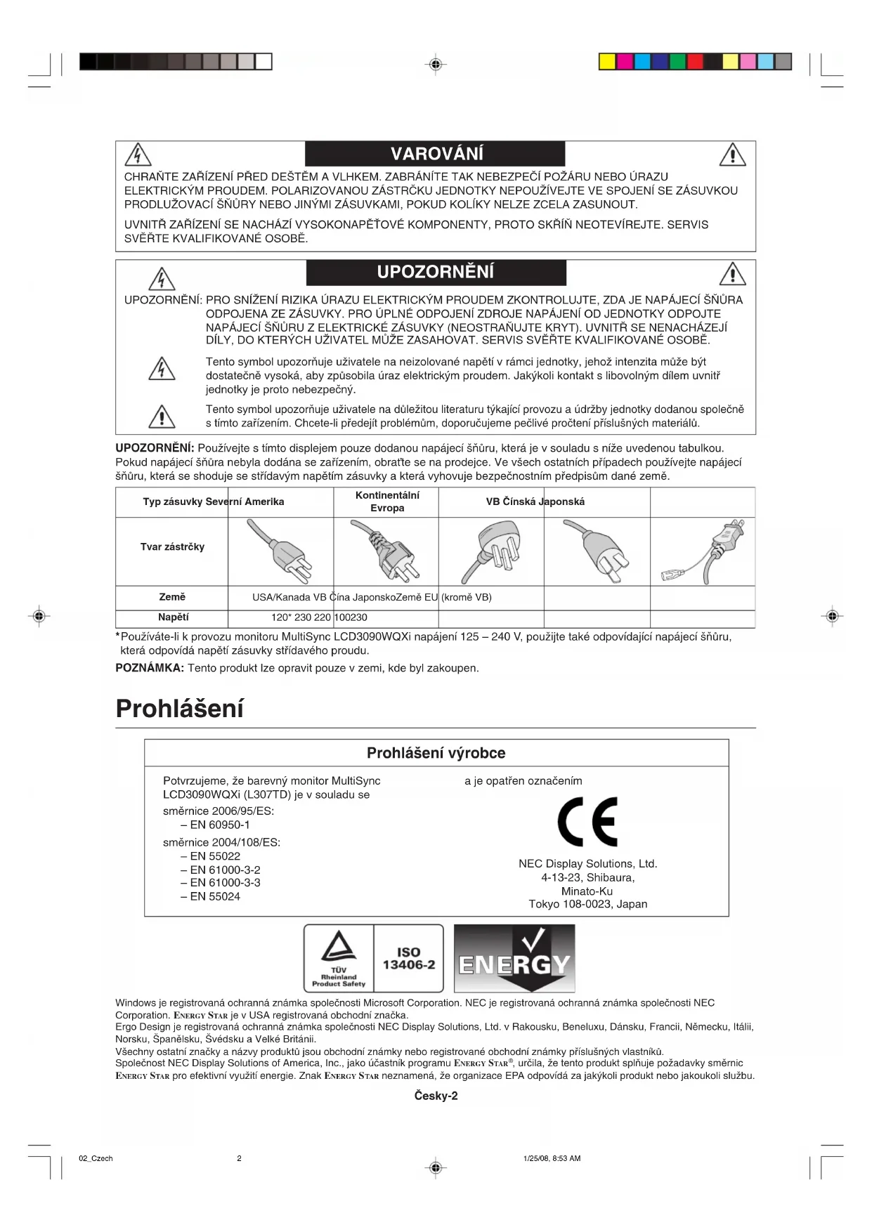 - Pfii pfiená‰ení jej nedrÏte pouze za podstavec. Dosvit obrazu: Dosvitem obrazu se oznaãuje zbytkov˘ obraz (“duchy”) pfiedchozího obrazu, kter˘ zÛstane viditeln˘ na obrazovce. Narozdíl od bûÏn˘ch monitorÛ není dosvit obrazu na displeji LCD permanentní, ale pfiesto by se mûlo pfiedejít zobrazení jednoho obrazu po dlouhou dobu. Chcete-li zmírnit dosvit obrazu, vypnûte monitor na stejnû dlouhou dobu, po jakou byl poslední obraz zobrazen. JestliÏe byl napfiíklad obraz na obrazovce hodinu a zÛstal po nûm zbytkov˘ obraz, mûli byste vypnout monitor opût na hodinu, aby obraz zmizel. POZNÁMKA: Stejnû jako u v‰ech osobních zobrazovacích zafiízení doporuãuje firma NEC DISPLAY SOLUTIONS pravidelné pouÏívání spofiiãÛ obrazovky pfii neãinnosti a vypnutí monitoru v dobû, kdy se nepouÏívá. UPOZORNùNÍ 02_Czech 1/25/08, 8:53 AM3âesky-4 SPRÁVN¯M UMÍSTùNÍM A NASTAVENÍM MONITORU MÒÎETE P¤EDEJÍT ÚNAVù OâÍ, BOLESTEM RAMEN A ·ÍJE. P¤I UMÍSËOVÁNÍ MONITORU POSTUPUJTE PODLE NÁSLEDUJÍCÍCH POKYNÒ: