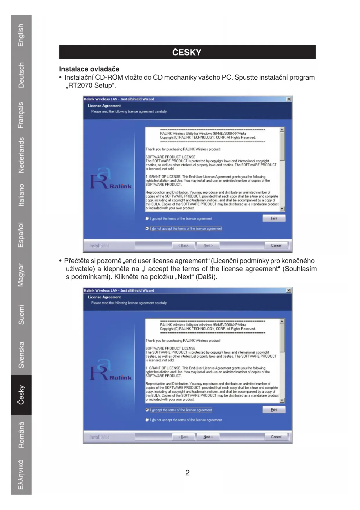 - Instalačni CD-ROM vložte do CD mechaníky vaseho PC. Spustě instalačné program „RT2070 Setup".