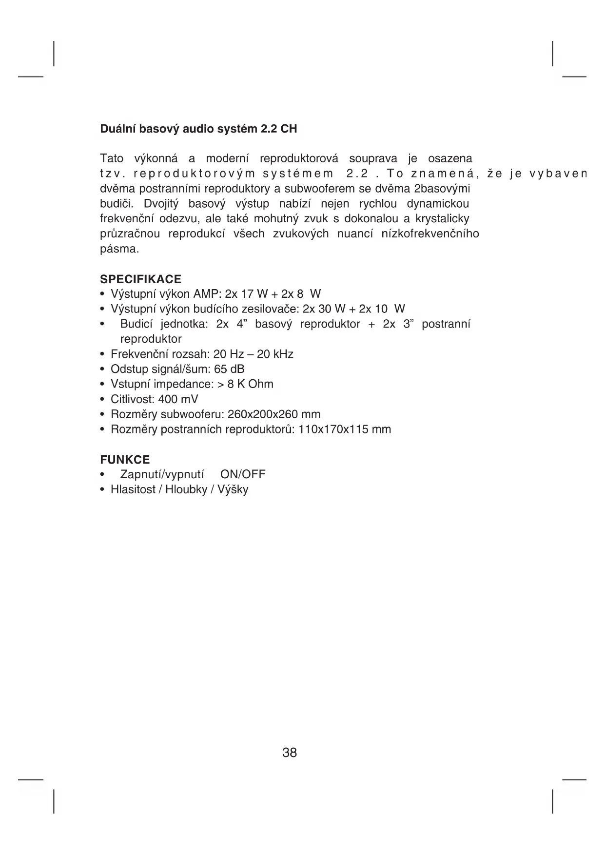 - Rozměry postranních reproduktorů: 110x170x115 mm FUNKCE