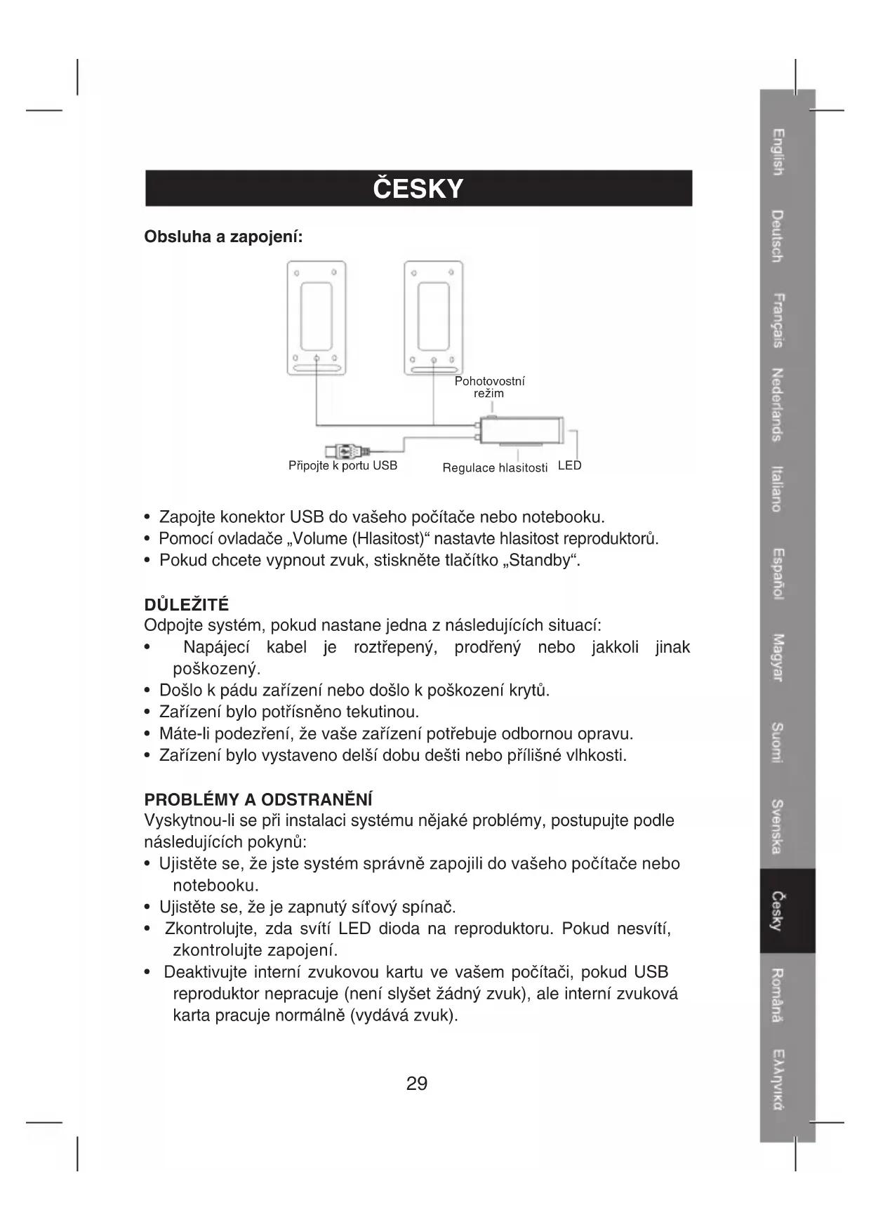 Společnost Nedis B.V. De Tweeling 28 5215MC ’s-Hertogenbosch Nizozemí Tel.: 0031 73 599 1055 E-mail: info@nedis.com prohlašuje, že výrobek: Značka: König Electronic Model: CMP-SPUSB30 Popis: USB 2.0 reproduktorová soustava 2*5W splňuje následující normy: EN55022: 1998 + A1: 2000 + A2: 2003 EN55024: 1998 + A1: 2001 + A2: 2003 EN61000-3-2: 2006 EN61000-3-3: 1995 + A1: 2001 + A2: 2005 a vyhovuje požadavkům směrnic Evropské unie 2004/108/EC. ‘s-Hertogenbosch 25. 3. 2009 Mrs. J. Gilad Obchodní ředitelka31 Bezpečnostní opatření: Nevystavujte zařízení nadměrné vlhkosti nebo vodě. Údržba: K čištění používejte pouze suchý hadřík. Nepoužívejte rozpouštědla ani abrazivní materiály. Záruka: Jakékoli změny, modifikace nebo poškození zařízení v důsledku nesprávného zacházení se zařízením ruší platnost záruční smlouvy. Obecné upozornění: Design, provedení a parametry výrobku se mohou měnit bez předchozího upozornění uživatele výrobcem. Všechna loga a názvy výrobků jsou obchodní značky nebo registrované obchodní značky příslušných vlastníků a jsou chráněny příslušnými zákony. Návod k použití uschovejte pro případnou pozdější potřebu. Upozornění: Tento výrobek je označen následujícím symbolem. To znamená, že s výrobkem je nutné zacházet jako s nebezpečným elektrickým a elektronickým odpadem a nelze jej po skončení životnosti vhazovat do běžného domácího odpadu. Výrobek je nutné odevzdat sběrným surovinám nebo recyklačnímu středisku, které se zabývá zpracováním nebezpečných odpadů. Copyright ©32 ROMÂNĂ Utilizare şi conectare Conectare la portul USB Standby Controlul volumului LED