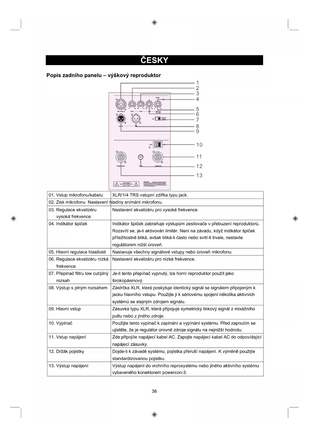 13. Výstup napájení Výstup napájení do vrchního reprosystému nebo jiného aktivního systému