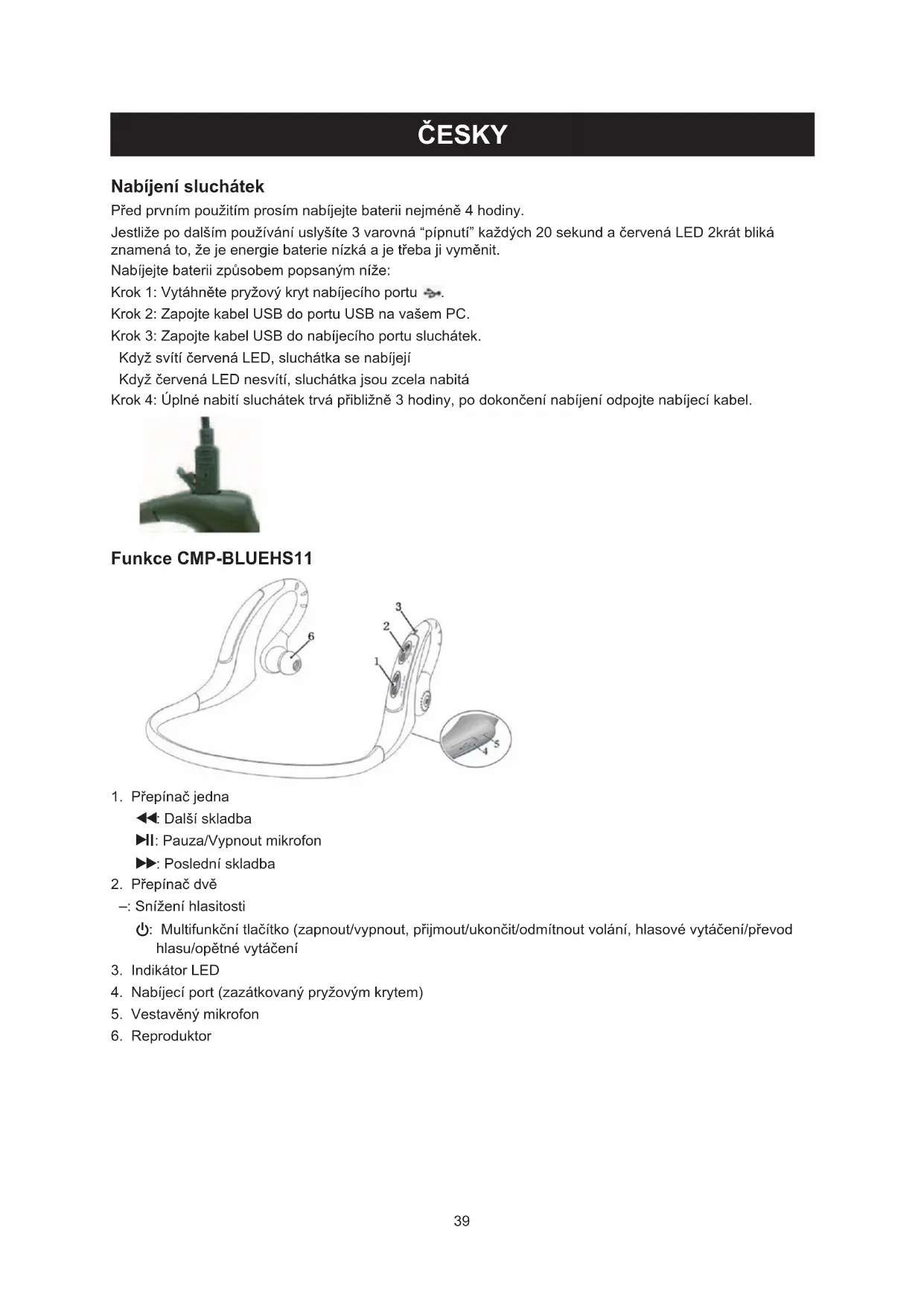 Krok 2: Zapojte kabel USB do portu USB na vašem PC. Krok 3: Zapojte kabel USB do nabíjecího portu sluchátek. Když svítí červená LED, sluchátka se nabíjejí Když červená LED nesvítí, sluchátka jsou zcela nabitá Krok 4: Úplné nabití sluchátek trvá přibližně 3 hodiny, po dokončení nabíjení odpojte nabíjecí kabel. Funkce CMP-BLUEHS11