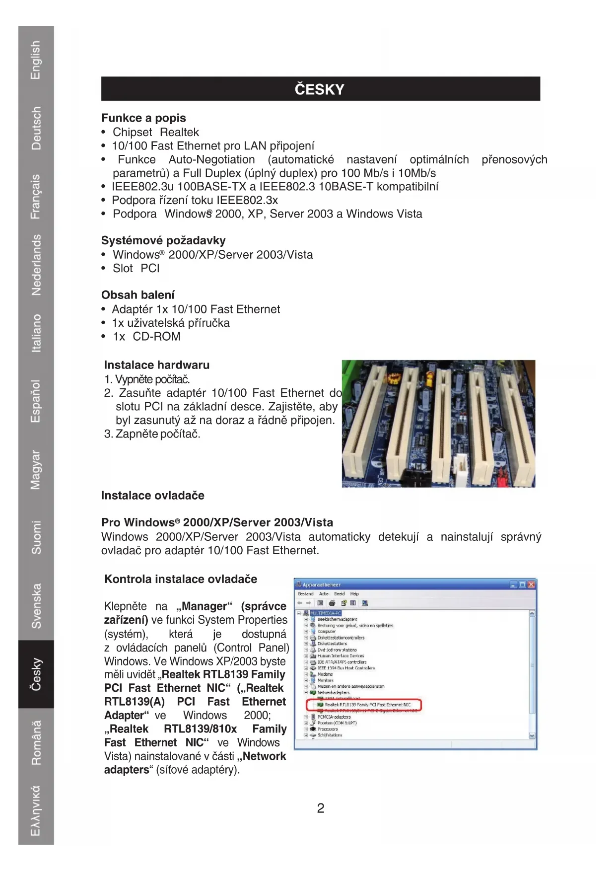 2000/XP/Server 2003/Vista Windows 2000/XP/Server 2003/Vista automaticky detekují a nainstalují správný ovladač pro adaptér 10/100 Fast Ethernet. Kontrola instalace ovladače Klepněte na „Manager“ (správce zařízení) ve funkci System Properties (systém), která je dostupná z ovládacích panelů (Control Panel) Windows. Ve Windows XP/2003 byste měli uvidět „Realtek RTL8139 Family PCI Fast Ethernet NIC“ („Realtek RTL8139(A) PCI Fast Ethernet Adapter“ ve Windows 2000; „Realtek RTL8139/810x Family Fast Ethernet NIC“ ve Windows Vista) nainstalované v části „Network adapters“ (síťové adaptéry).3 Prohlášení o shodě Společnost Nedis B.V. De Tweeling 28 5215MC ’s-Hertogenbosch Nizozemí Tel.: 0031 73 599 1055 E-mail: info@nedis.com prohlašuje, že výrobek: Značka: König Electronic Model: CMP-NWCARD12 Popis: PCI LAN karta 10/100 Mb splňuje následující normy: Elektromagnetická kompatibilita (EMC) EN 55022:1998+A1:2000+A2:2003 EN 55024:1998+A1:2001+A2:2003 EN 61000-3-2:2000 EN 61000-3-3:1995+A1:2001 a je v souladu s požadavky směrnic Evropské unie 2004/108/EC. ‘s-Hertogenbosch 1. května 2009 Paní J. Gilad Ředitelka nákupního oddělení4 Bezpečnostní opatření: NEBEZPEČÍ ÚRAZU