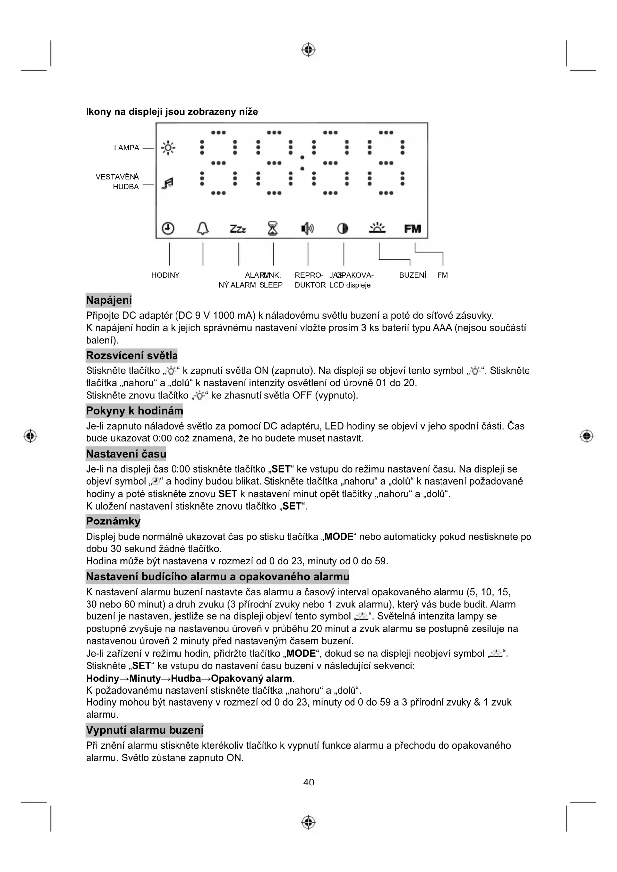 NÝ ALARM FUNK. SLEEP REPRO- DUKTOR JAS LCD displeje BUZENÍ FM Napájení Připojte DC adaptér (DC 9 V 1000 mA) k náladovému světlu buzení a poté do síťové zásuvky. K napájení hodin a k jejich správnému nastavení vložte prosím 3 ks baterií typu AAA (nejsou součástí balení). Rozsvícení světla Stiskněte tlačítko „ “ k zapnutí světla ON (zapnuto). Na displeji se objeví tento symbol „ “. Stiskněte tlačítka „nahoru“ a „dolů“ k nastavení intenzity osvětlení od úrovně 01 do 20. Stiskněte znovu tlačítko „ “ ke zhasnutí světla OFF (vypnuto). Pokyny k hodinám Je-li zapnuto náladové světlo za pomocí DC adaptéru, LED hodiny se objeví v jeho spodní části. Čas bude ukazovat 0:00 což znamená, že ho budete muset nastavit. Nastavení času Je-li na displeji čas 0:00 stiskněte tlačítko „SET“ ke vstupu do režimu nastavení času. Na displeji se objeví symbol „ “ a hodiny budou blikat. Stiskněte tlačítka „nahoru“ a „dolů“ k nastavení požadované hodiny a poté stiskněte znovu SET k nastavení minut opět tlačítky „nahoru“ a „dolů“. K uložení nastavení stiskněte znovu tlačítko „SET“. Poznámky Displej bude normálně ukazovat čas po stisku tlačítka „MODE“ nebo automaticky pokud nestisknete po dobu 30 sekund žádné tlačítko. Hodina může být nastavena v rozmezí od 0 do 23, minuty od 0 do 59. Nastavení budícího alarmu a opakovaného alarmu K nastavení alarmu buzení nastavte čas alarmu a časový interval opakovaného alarmu (5, 10, 15, 30 nebo 60 minut) a druh zvuku (3 přírodní zvuky nebo 1 zvuk alarmu), který vás bude budit. Alarm buzení je nastaven, jestliže se na displeji objeví tento symbol „ “. Světelná intenzita lampy se postupně zvyšuje na nastavenou úroveň v průběhu 20 minut a zvuk alarmu se postupně zesiluje na nastavenou úroveň 2 minuty před nastaveným časem buzení. Je-li zařízení v režimu hodin, přidržte tlačítko „MODE“, dokud se na displeji neobjeví symbol „