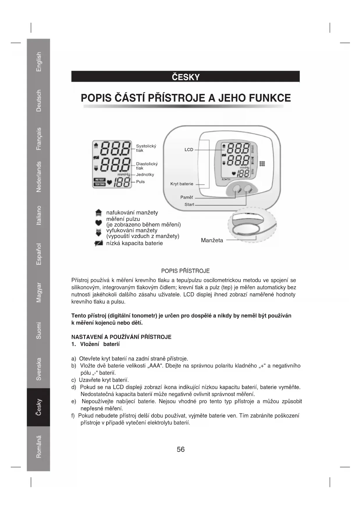 Přístroj používá k měření krevního tlaku a tepu/pulzu oscilometrickou metodu ve spojení se silikonovým, integrovaným tlakovým čidlem; krevní tlak a pulz (tep) je měřen automaticky bez nutnosti jakéhokoli dalšího zásahu uživatele. LCD displej ihned zobrazí naměřené hodnoty krevního tlaku a pulsu. Tento přístroj (digitální tonometr) je určen pro dospělé a nikdy by neměl být používán k měření kojenců nebo dětí. NASTAVENÍ A POUŽÍVÁNÍ PŘÍSTROJE