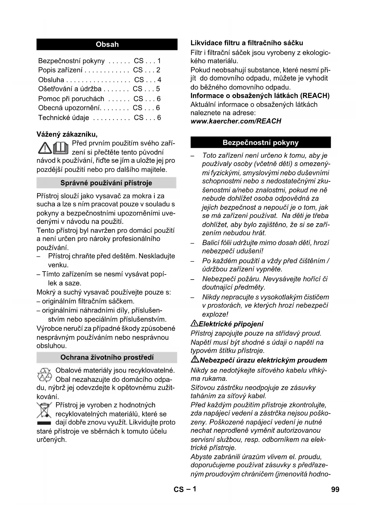 • A hálózati kábel valószínűleg szennye- zett, tisztítsa meg a hálózati kábelt. Ha a készülék szívóteljesítménye alábbhagy, akkor kérem ellenőrizze a következő ponto- kat. Tartozékok, szívótömlő vagy szívócső el van záródva, az elzáródást egy pálcával távolítsa el. A patronszűrő piszkos: Efficient szűrőtisztítással nem rendel- kező készülékek esetén: A patronszűrőt lekopogtatni, szükség esetén folyóvíz alatt tisztítani. (lásd a leírást / ábrát ) Efficient szűrőtisztítóval rendelkező készülékek esetén: Működtesse a szűrő- tisztítást. (lásd a leírást / ábrát ) A patronszűrőt szükség esetén folyóvíz alatt tisztítani. (lásd a leírást / ábrát ) Cserélje ki a megrongálódott patronszű- rőt. A porzsák megtelt, helyezzen be új por- zsákot. (lásd a leírást / ábrát ) Minden országban az illetékes forgalmazó vállalat által kiadott szavatossági feltételek ér- vényesek. A készülék esetleges hibáit a ga- ranciaidőn belül költségmentesen megszüntetjük, ha azok anyag- vagy gyártási hibára vezethetők vissza. Garanciális igény esetén kérjük, a számlával együtt forduljon kereskedőjéhez vagy a legközelebbi, ilyen esetek intézésére jogosult vevőszolgálathoz. (A címet lásd a hátoldalon) Kérdések vagy üzemzavar esetén KÄR- CHER-telephelyünk szívesen segít Önnek. (A címet lásd a hátoldalon) Az üzemeltetési útmutató végén talál egy vá- logatást a legtöbbször szükséges alkatré- szekről. Alkatrészeket és tartozékokat kereskedőjénél vagy KÄRCHER-telephelyen kaphat. (A címet lásd a hátoldalon) A műszaki adatok a kinyitható oldalon találha- tók. Az ott használt szimbólumok magyaráza- ta után. A műszaki adatok módosításának jogát fenntartjuk! Segítség üzemzavar esetén A hálózati kábel feltekerése nem működik Csökkenő szívóteljesítmény Általános megjegyzések Garancia Szerviz Alkatrészek és különleges tartozékok megrendelése Műszaki adatok Feszültség Teljesítmény P névl Teljesítmény P max A készülék dugalj max. csatlako- zási teljesítménye Hálózati biztosító (lomha) Tartály térfogata Vízfelvétel fogantyúval Vízfelvétel padlófejjel Hálózati kábel Hangnyomás szint (EN 60704-2-1) Tartozékok nélküli súly 98 HUeština – 1 Vážený zákazníku, Před prvním použitím svého zaří- zení si přečtěte tento původní návod k používání, řiďte se jím a uložte jej pro pozdější použití nebo pro dalšího majitele. Přístroj slouží jako vysavač za mokra i za sucha a lze s ním pracovat pouze v souladu s pokyny a bezpečnostními upozorněními uve- denými v návodu na použití. Tento přístroj byl navržen pro domácí použití a není určen pro nároky profesionálního používání. – Přístroj chraňte před deštěm. Neskladujte venku. – Tímto zařízením se nesmí vysávat popí- lek a saze. Mokrý a suchý vysavač používejte pouze s: – originálním filtračním sáčkem. – originálními náhradními díly, příslušen- stvím nebo speciálním příslušenstvím. Výrobce neručí za případné škody způsobené nesprávným používáním nebo nesprávnou obsluhou. Obalové materiály jsou recyklovatelné. Obal nezahazujte do domácího odpa- du, nýbrž jej odevzdejte k opětovnému zužit- kování. Přístroj je vyroben z hodnotných recyklovatelných materiálů, které se dají dobře znovu využít. Likvidujte proto staré přístroje ve sběrnách k tomuto účelu určených. Filtr i filtrační sáček jsou vyrobeny z ekologic- kého materiálu. Pokud neobsahují substance, které nesmí při- jít do domovního odpadu, můžete je vyhodit do běžného domovního odpadu. Informace o obsažených látkách (REACH) Aktuální informace o obsažených látkách naleznete na adrese: www.kaercher.com/REACH – Toto zařízení není určeno k tomu, aby je používaly osoby (včetně dětí) s omezený- mi fyzickými, smyslovými nebo duševními schopnostmi nebo s nedostatečnými zku- šenostmi a/nebo znalostmi, pokud ne ně nebude dohlížet osoba odpovědná za jejich bezpečnost a nepoučí je o tom, jak se má zařízení používat. Na děti je třeba dohlížet, aby bylo zajištěno, že si se zaří- zením nebudou hrát. – Balicí fólii udržujte mimo dosah dětí, hrozí nebezpečí udušení! – Po každém použití a vždy před čištěním / údržbou zařízení vypněte. – Nebezpečí požáru. Nevysávejte hořící či doutnající předměty. – Nikdy nepracujte s vysokotlakým čističem v prostorách, ve kterých hrozí nebezpečí exploze! 몇 Elektrické připojení Přístroj zapojujte pouze na střídavý proud. Napětí musí být shodné s údaji o napětí na typovém štítku přístroje. Nebezpečí úrazu elektrickým proudem Nikdy se nedotýkejte síťového kabelu vlhký- ma rukama. Síťovou zástrčku neodpojuje ze zásuvky taháním za síťový kabel. Před každým použitím přístroje zkontrolujte, zda napájecí vedení a zástrčka nejsou poško- zeny. Poškozené napájecí vedení je nutné nechat neprodleně vyměnit autorizovanou servisní službou, resp. odborníkem na elek- trické přístroje. Abyste zabránili úrazům vlivem el. proudu, doporučujeme používat zásuvky s předřaze- ným proudovým chráničem (jmenovitá hodno- Obsah Bezpečnostní pokyny