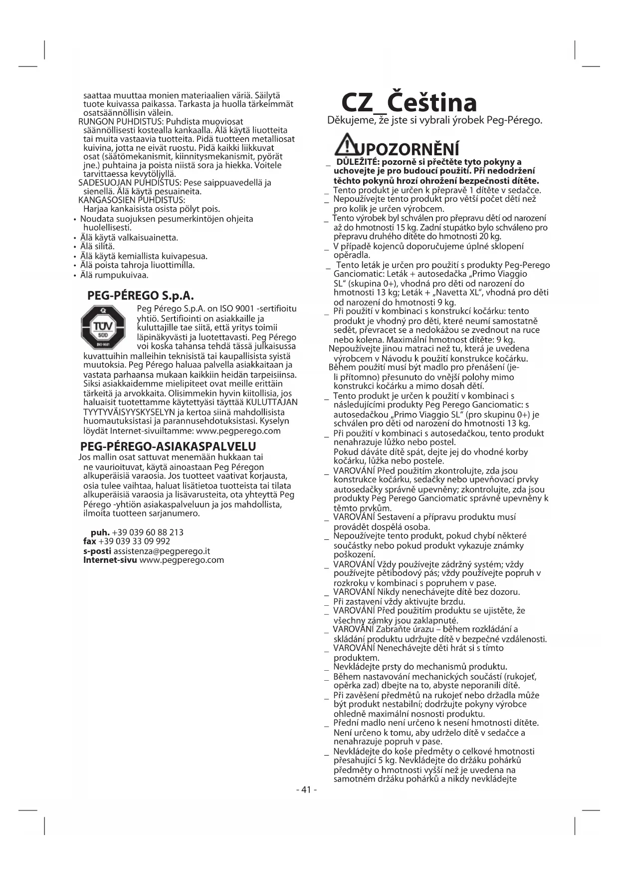 ja vedeltä. Jatkuva altistuminen auringonvalolle- 41 - saattaa muuttaa monien materiaalien väriä. Säilytä tuote kuivassa paikassa. Tarkasta ja huolla tärkeimmät osatsäännöllisin välein. RUNGON PUHDISTUS: Puhdista muoviosat säännöllisesti kostealla kankaalla. Älä käytä liuotteita tai muita vastaavia tuotteita. Pidä tuotteen metalliosat kuivina, jotta ne eivät ruostu. Pidä kaikki liikkuvat osat (säätömekanismit, kiinnitysmekanismit, pyörät jne.) puhtaina ja poista niistä sora ja hiekka. Voitele tarvittaessa kevytöljyllä. SADESUOJAN PUHDISTUS: Pese saippuavedellä ja sienellä. Älä käytä pesuaineita. KANGASOSIEN PUHDISTUS: Harjaa kankaisista osista pölyt pois. • Noudata suojuksen pesumerkintöjen ohjeita huolellisesti. • Älä käytä valkaisuainetta. • Älä silitä. • Älä käytä kemiallista kuivapesua. • Älä poista tahroja liuottimilla. • Älä rumpukuivaa. PEG-PÉREGO S.p.A. Peg Pérego S.p.A. on ISO 9001 -sertifioitu yhtiö. Sertifiointi on asiakkaille ja kuluttajille tae siitä, että yritys toimii läpinäkyvästi ja luotettavasti. Peg Pérego voi koska tahansa tehdä tässä julkaisussa kuvattuihin malleihin teknisistä tai kaupallisista syistä muutoksia. Peg Pérego haluaa palvella asiakkaitaan ja vastata parhaansa mukaan kaikkiin heidän tarpeisiinsa. Siksi asiakkaidemme mielipiteet ovat meille erittäin tärkeitä ja arvokkaita. Olisimmekin hyvin kiitollisia, jos haluaisit tuotettamme käytettyäsi täyttää KULUTTAJAN TYYTYVÄISYYSKYSELYN ja kertoa siinä mahdollisista huomautuksistasi ja parannusehdotuksistasi. Kyselyn löydät Internet-sivuiltamme: www.pegperego.com PEG-PÉREGO-ASIAKASPALVELU Jos mallin osat sattuvat menemään hukkaan tai ne vaurioituvat, käytä ainoastaan Peg Péregon alkuperäisiä varaosia. Jos tuotteet vaativat korjausta, osia tulee vaihtaa, haluat lisätietoa tuotteista tai tilata alkuperäisiä varaosia ja lisävarusteita, ota yhteyttä Peg Pérego -yhtiön asiakaspalveluun ja jos mahdollista, ilmoita tuotteen sarjanumero. puh. +39 039 60 88 213 fax +39 039 33 09 992 s-posti assistenza@pegperego.it Internet-sivu www.pegperego.com CZ_Čeština