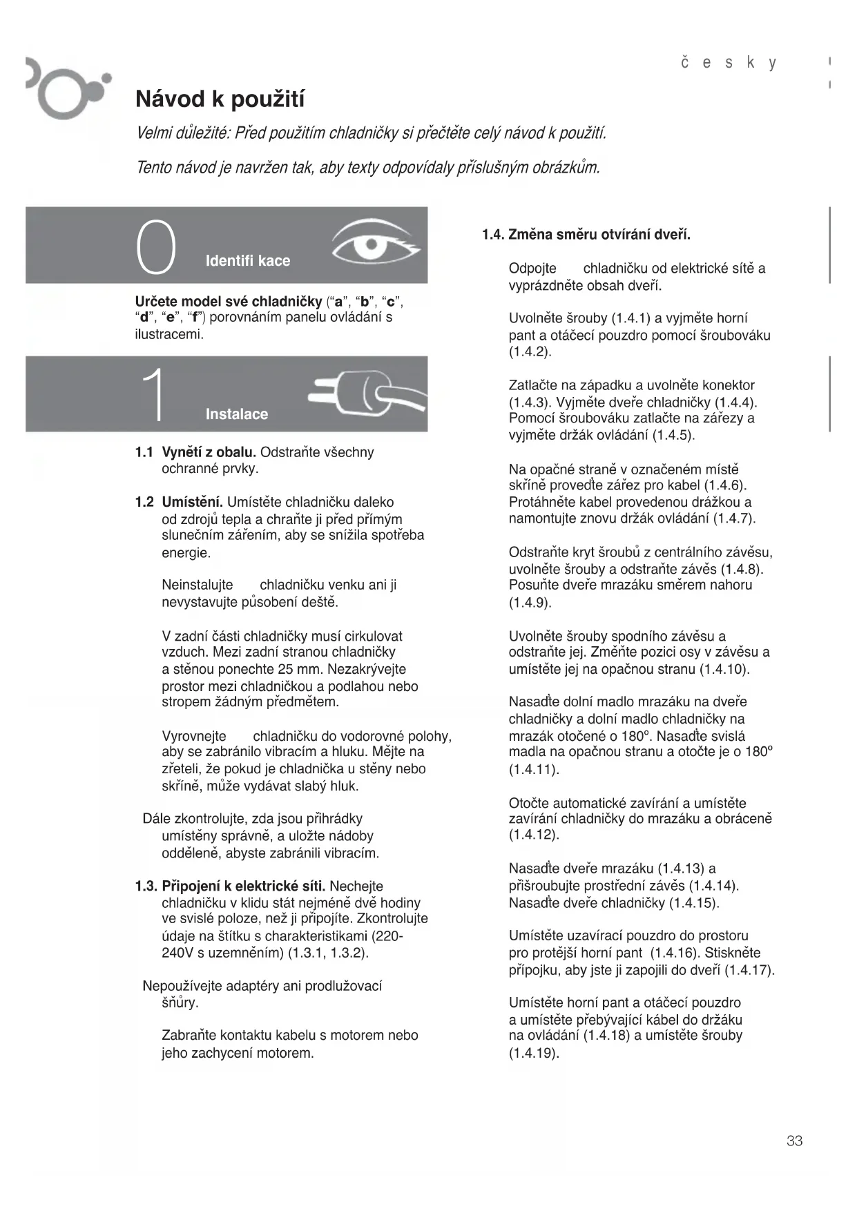 1.3. Pripojeni k elektricke siti. Nechejte chladnicku v klidu stat nejmene dve hodiny ve svisle poloze, než ji pripojite. Zkontrolujte udaje na štitku s characteristikami (220-240V s uzemném) (1.3.1, 1.3.2).