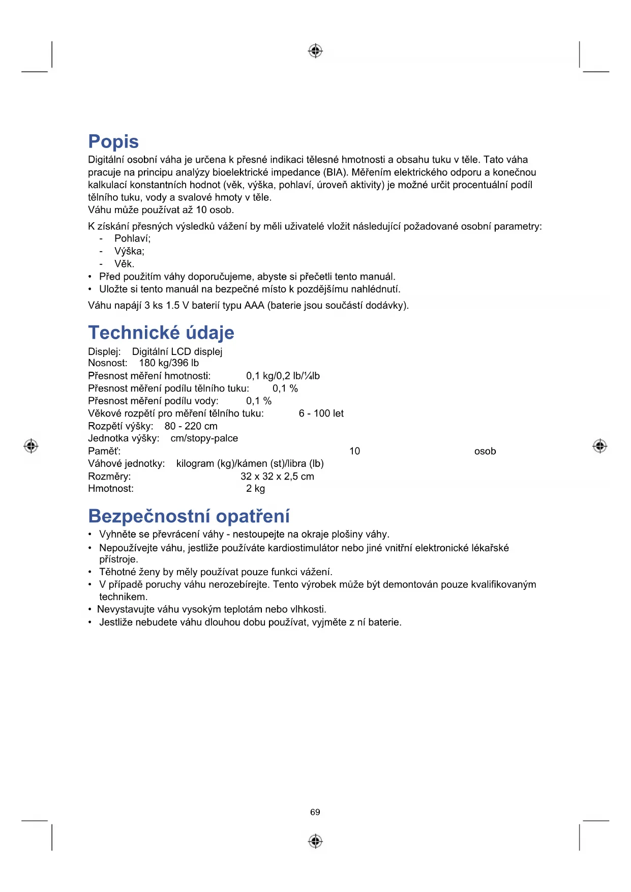 - Uložte si tento manuál na bezpečné místo k pozdějšímu nahlédnutí. Váhu napájí 3 ks 1.5 V baterií typu AAA (baterie jsou součástí dodávky). Technické údaje Displej: Digitální LCD displej Nosnost: 180 kg/396 lb Přesnost měření hmotnosti: 0,1 kg/0,2 lb/¼lb Přesnost měření podílu tělního tuku: 0,1 % Přesnost měření podílu vody: 0,1 % Věkové rozpětí pro měření tělního tuku: 6 - 100 let Rozpětí výšky: 80 - 220 cm Jednotka výšky: cm/stopy-palce Paměť: 10 osob Váhové jednotky: kilogram (kg)/kámen (st)/libra (lb) Rozměry: 32 x 32 x 2,5 cm Hmotnost: 2 kg Bezpečnostní opatření