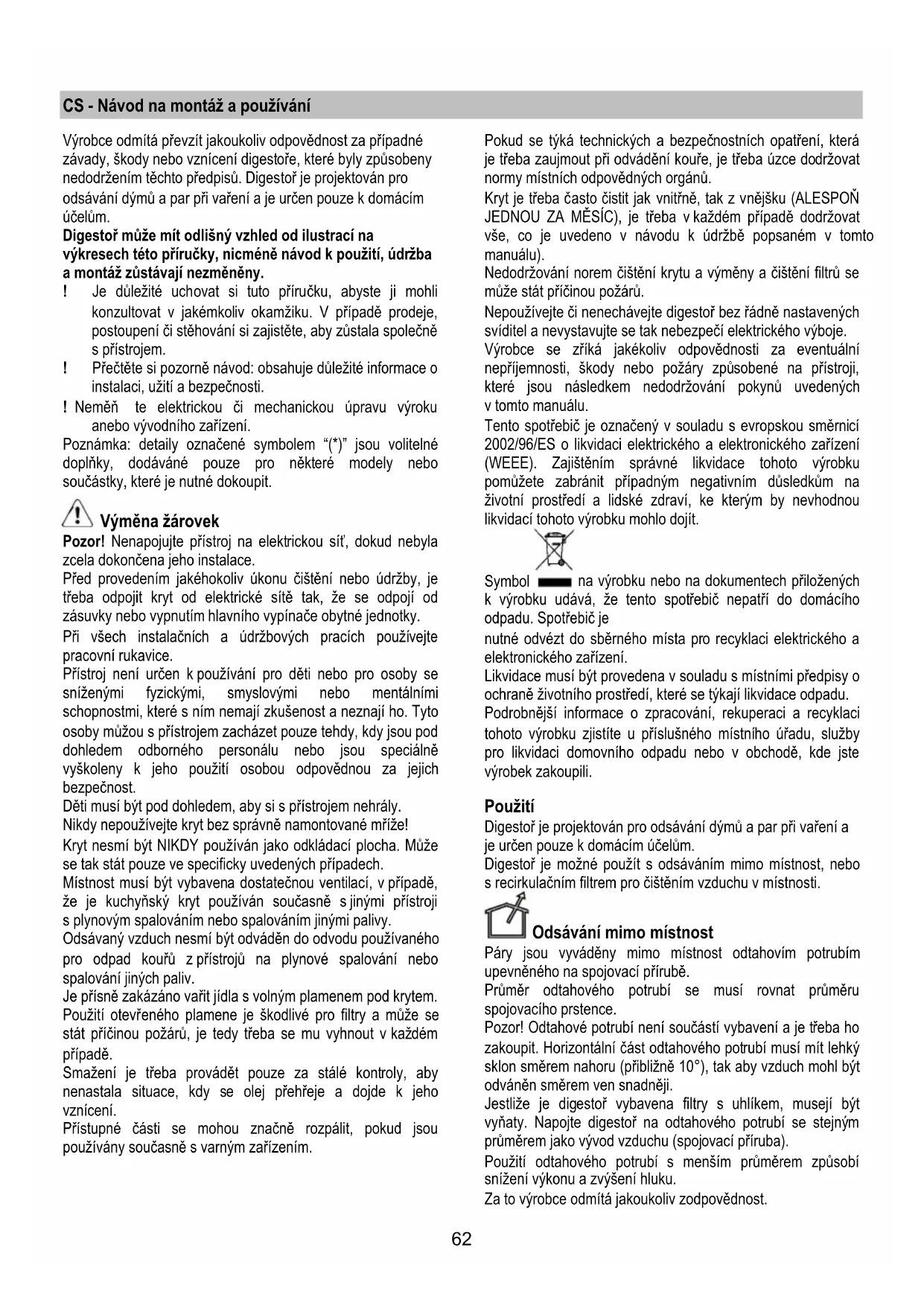 nedodržením těchto předpisů. Digestoř je projektován pro