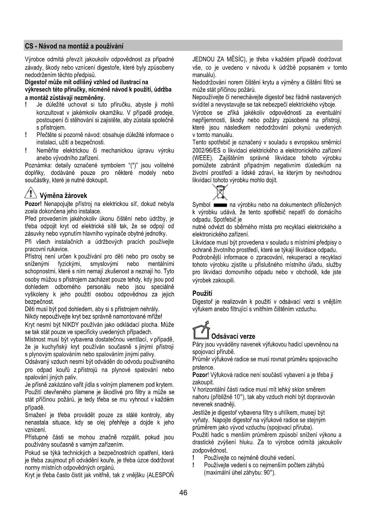 Digestoř musí být často čištěna, jak uvnitř tak zevně (alespoň